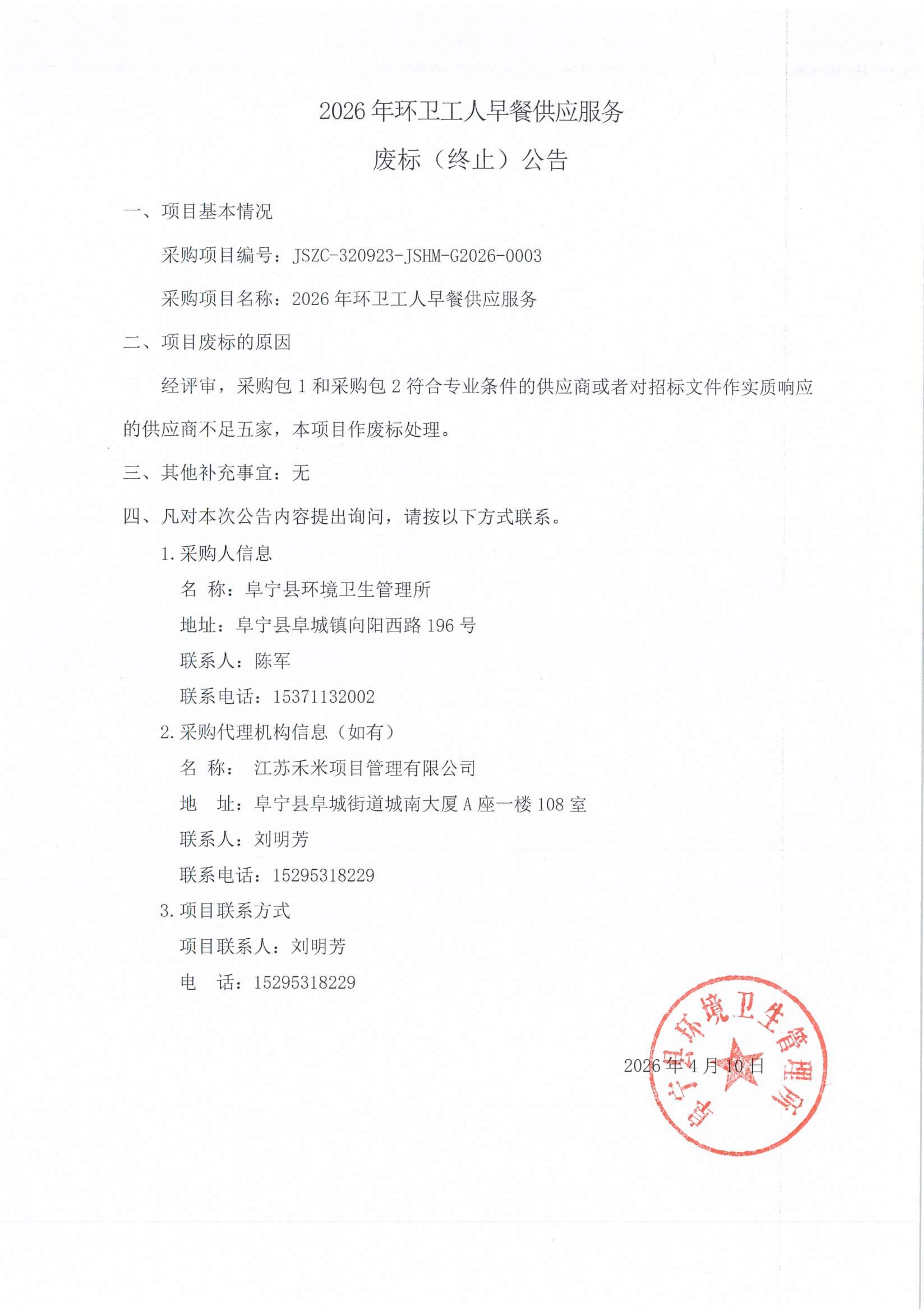 2026年环卫工人早餐供应服务废标(终止)公告