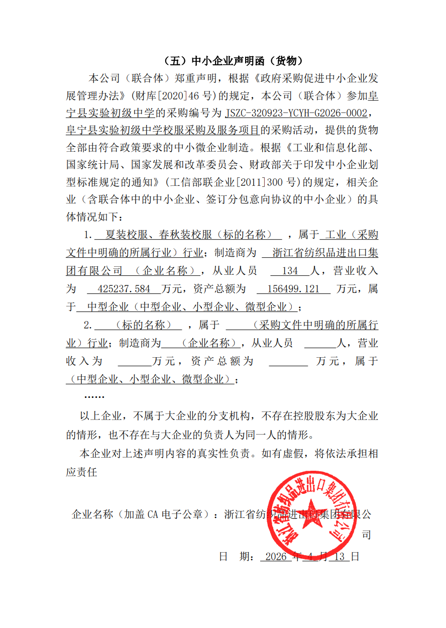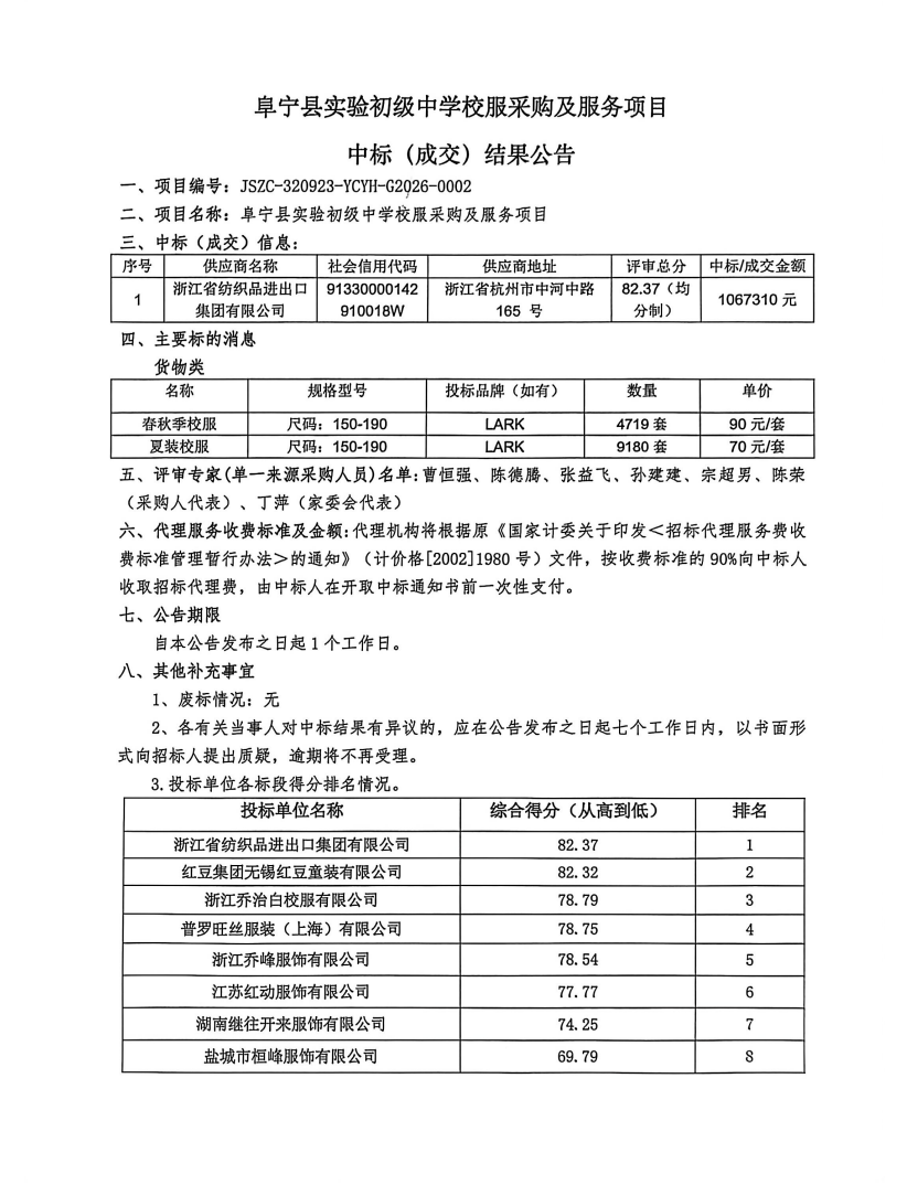 阜宁县实验初级中学校服采购及服务项目中标(成交)结果公告