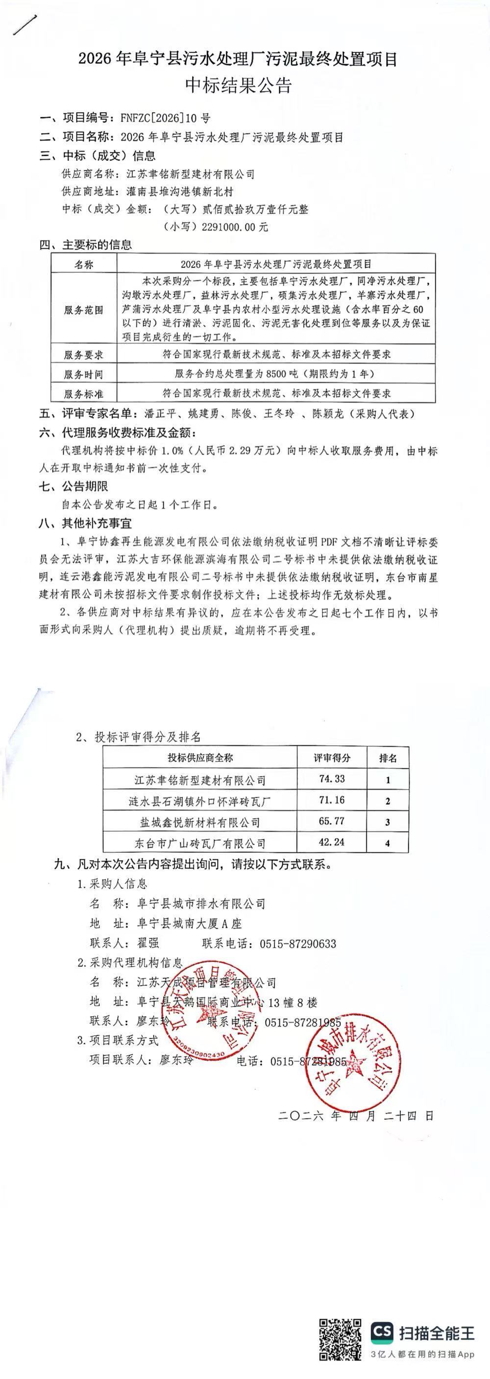 2026年阜宁县污水处理厂污泥最终处置项目中标结果公告