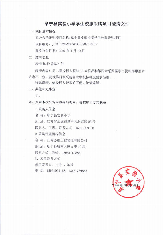 阜宁县实验小学学生校服采购项目澄清文件