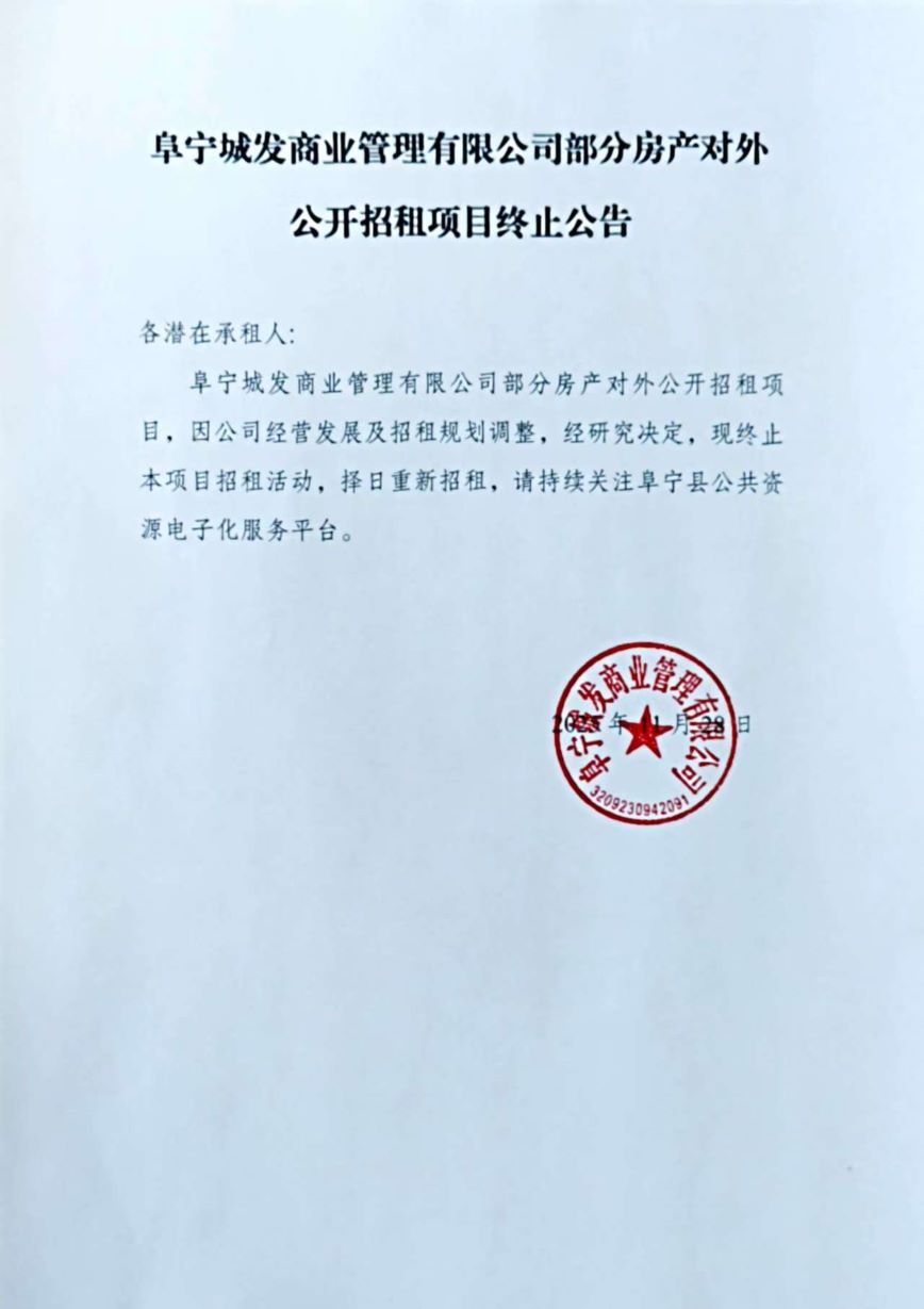 关于城发商业管理有限公司部分房产对外公开招租(项目编号:FNCQ[2025]11-005号)的终止公告