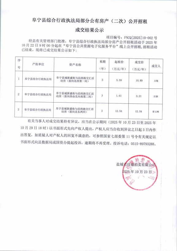 阜宁县综合行政执法局部分公有房产(二次)公开成交结果公示FNCQ[2025]10-002号