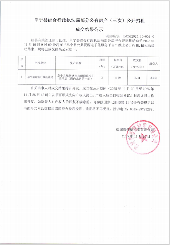 阜宁县综合行政执法局部分公有房产(三次)公开招租公告FNCQ[2025]10-002号
