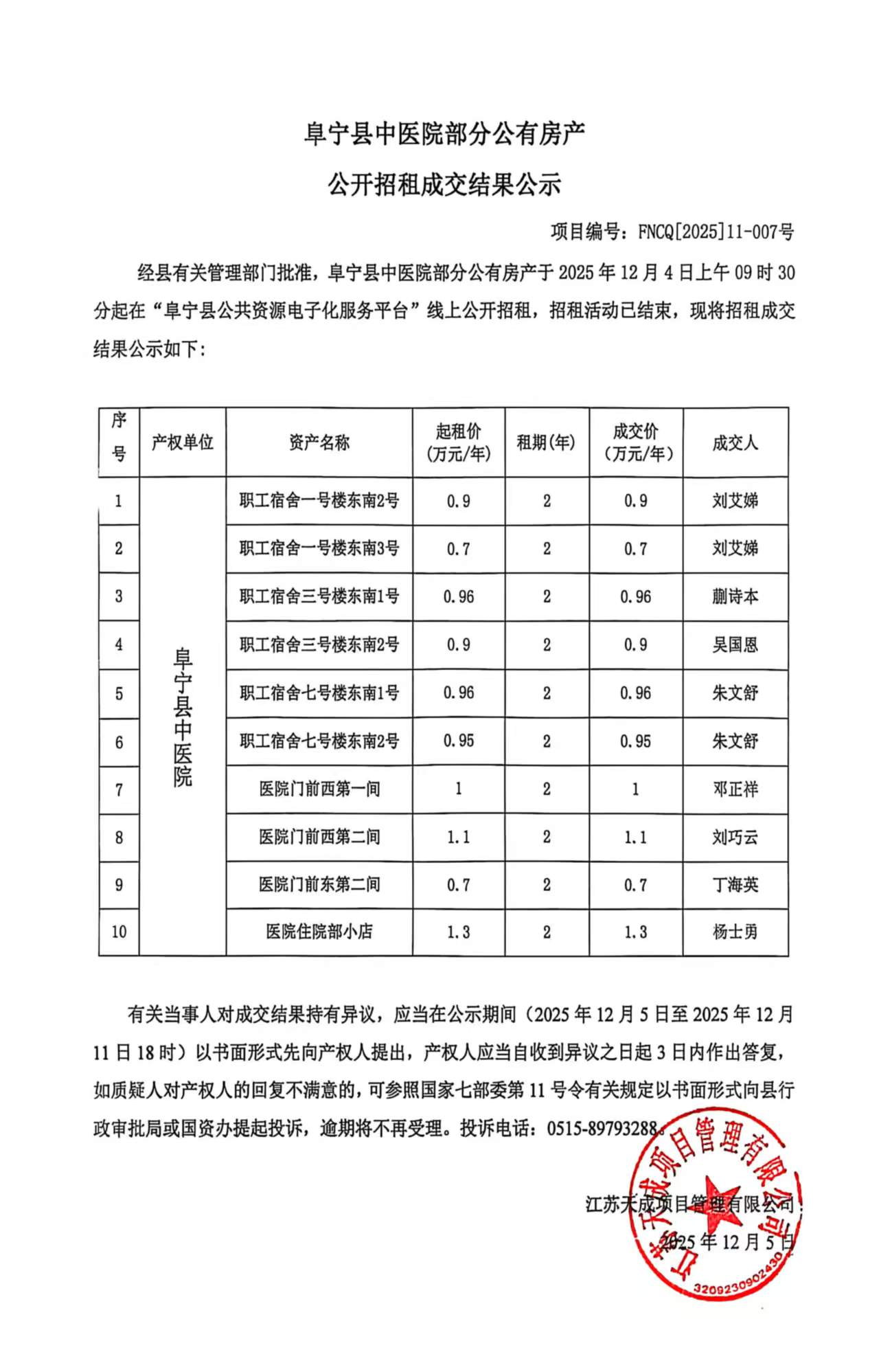 阜宁县中医院部分公有房产对外公开招租成交结果公示