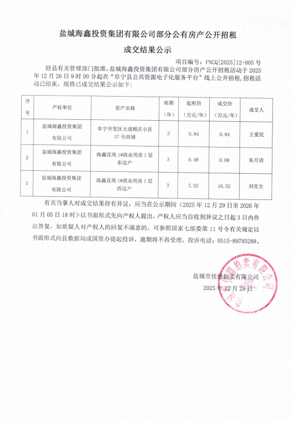 盐城海鑫投资集团有限公司部分公有房产公开拍租成交结果公示