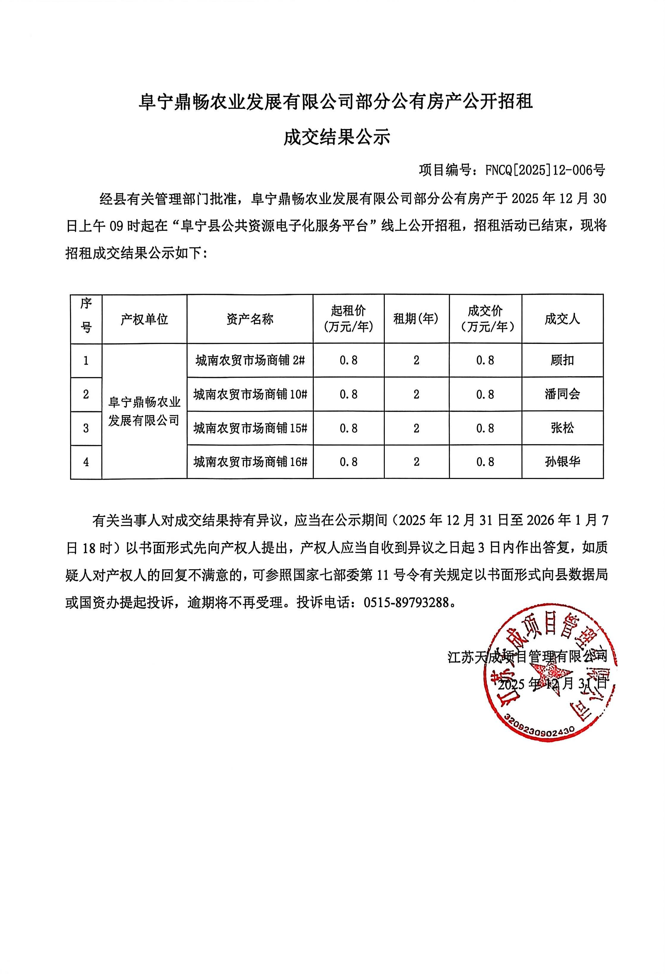 阜宁鼎畅农业发展有限公司部分公有房产公开招租成交结果公示