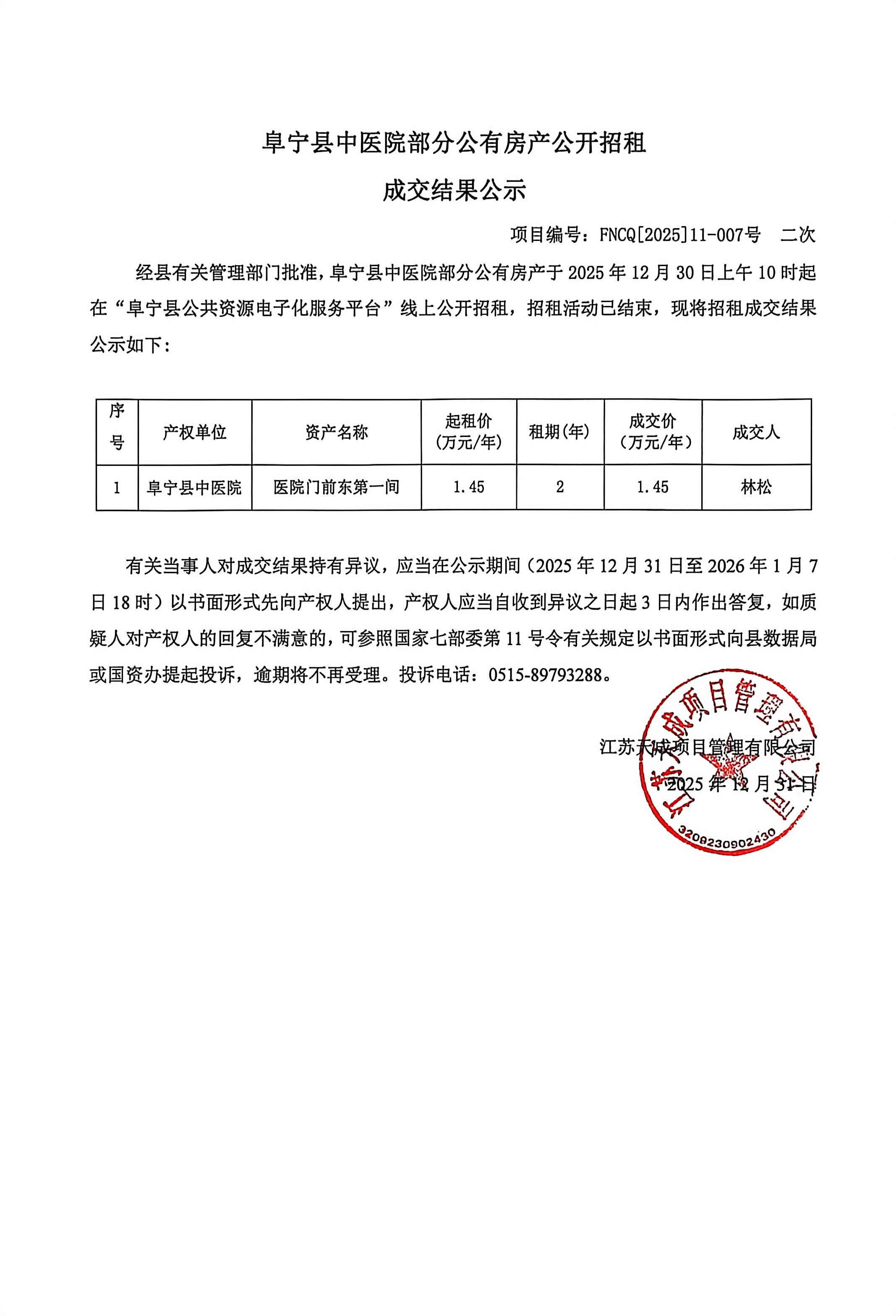 阜宁县中医院部分公有房产公开招租成交结果公示