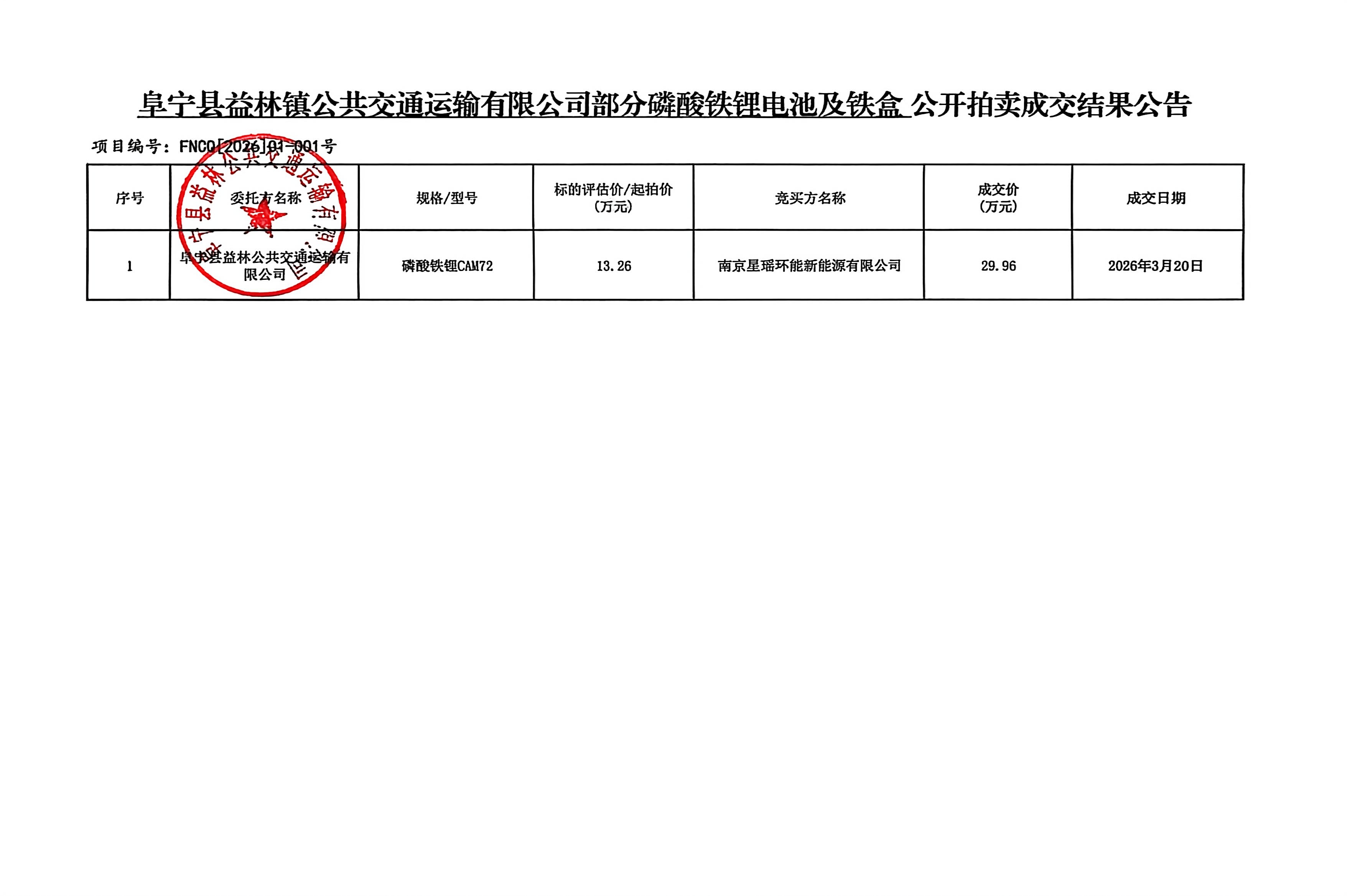 阜宁县益林镇公共交通运输有限公司部分磷酸铁锂电池及铁盒对外公开拍卖成交结果公示