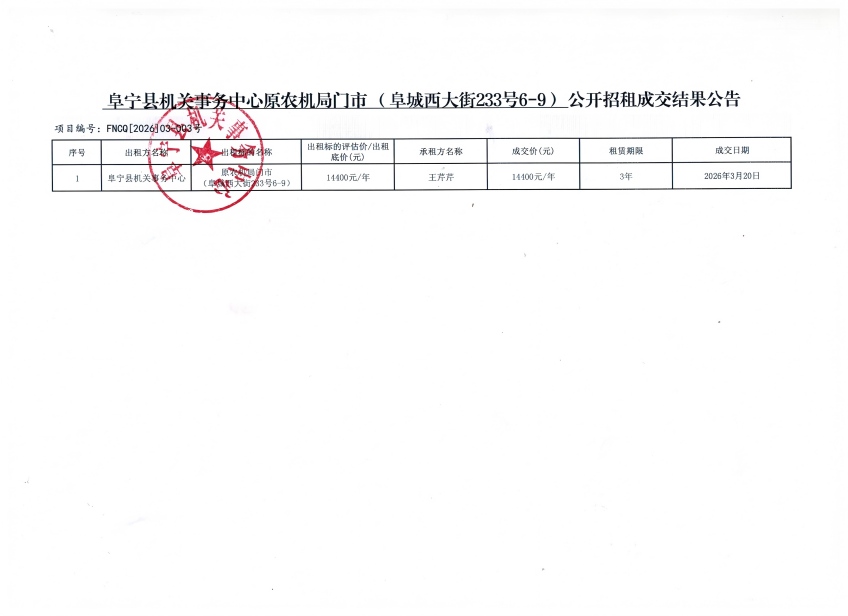 阜宁县机关事务中心原农机局门市 (阜城西大街233号6-9) 公开招租成交结果