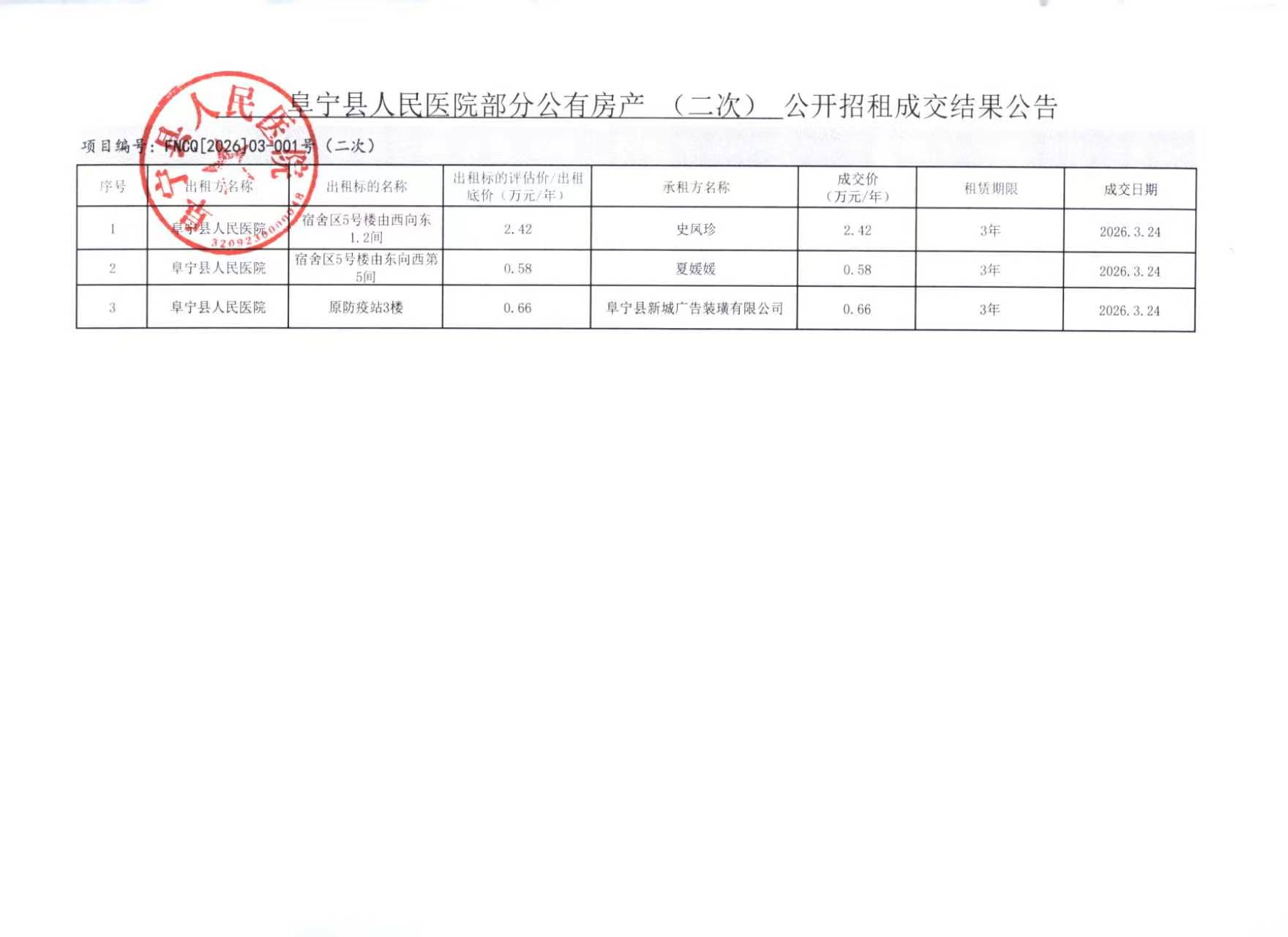 阜宁县人民医院部分公有房产公开招租成交结果公告FNCQ[2026]03-001号(二次)