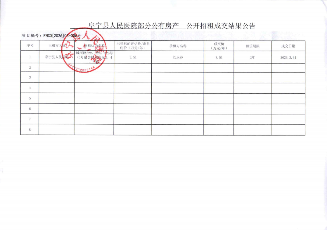 阜宁县人民医院部分公有房产公开招租成交结果公告FNCQ[2026]03-006号