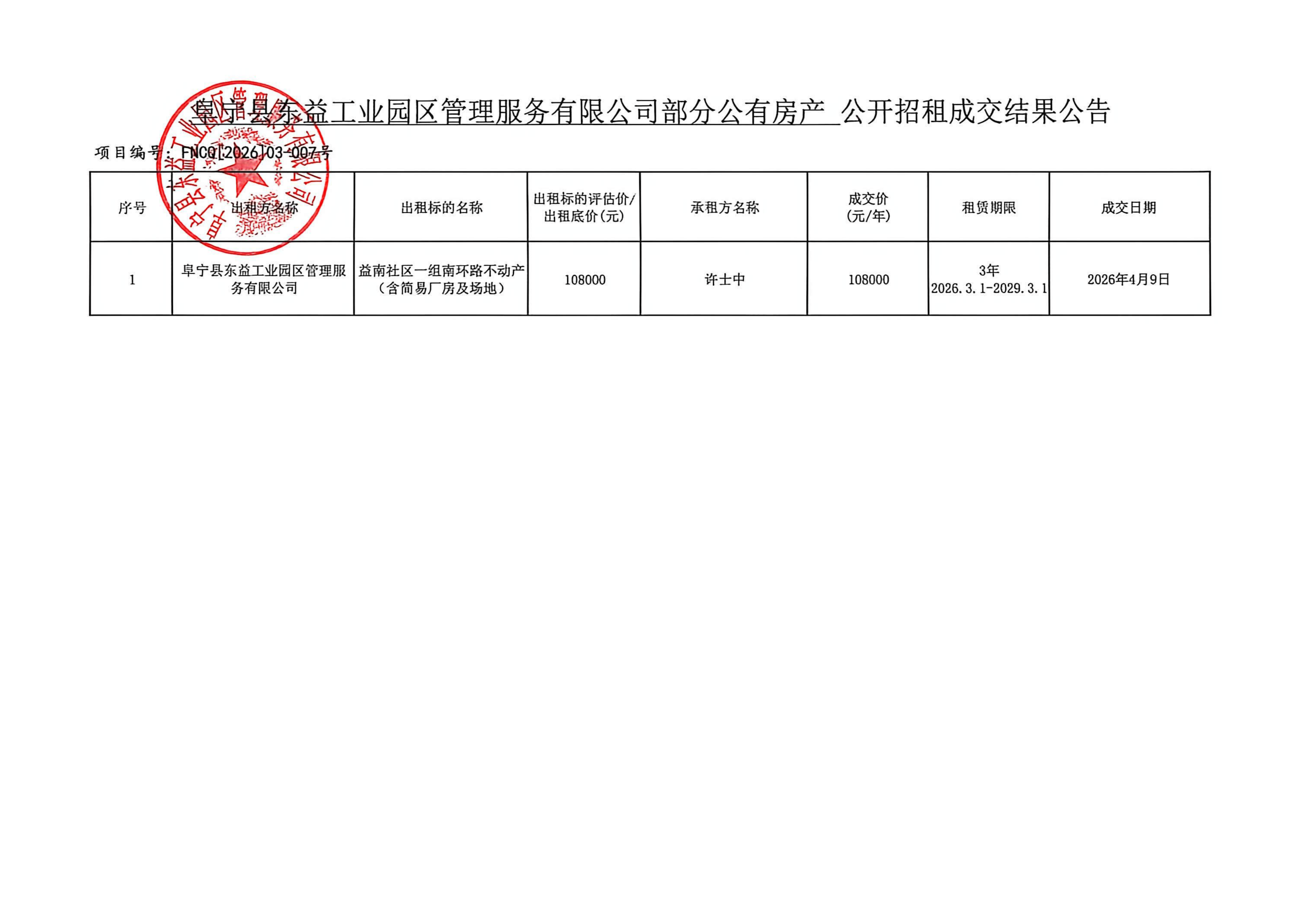 阜宁县东益工业园区管理服务有限公司部分公有房产对外公开招租成交结果公示