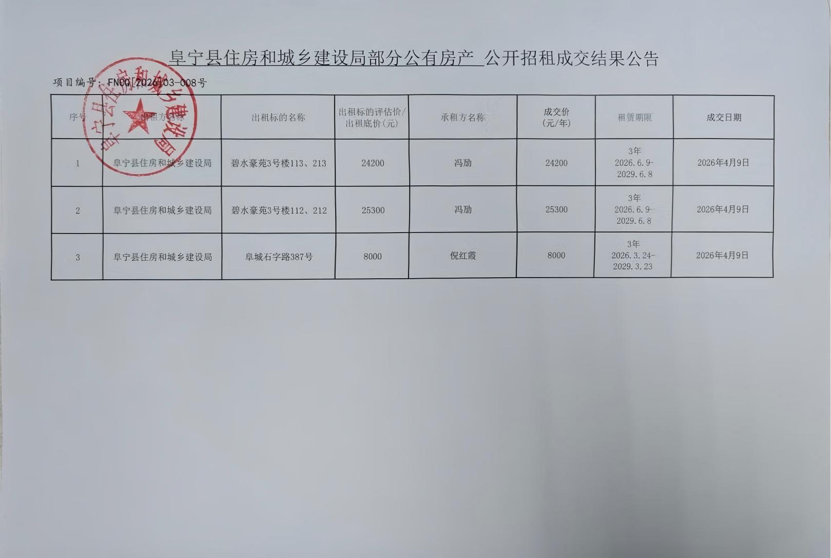 阜宁县住房和城乡建设局部分公有房产对外公开招租成交结果公示