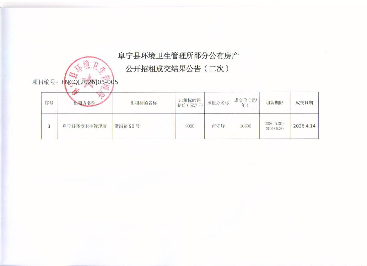 阜宁县环境卫生管理所部分公有房产二次公开招租成交结果公告