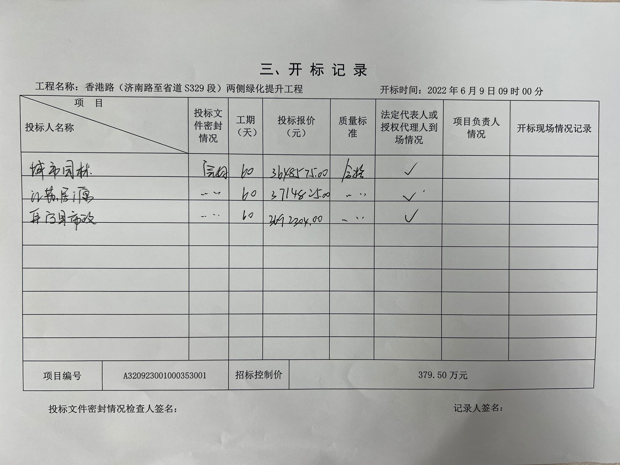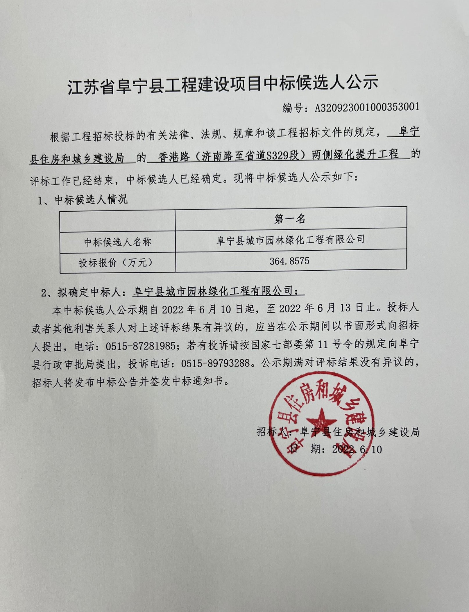 香港路(济南路至省道S329段)两侧绿化提升工程中标候选人公示