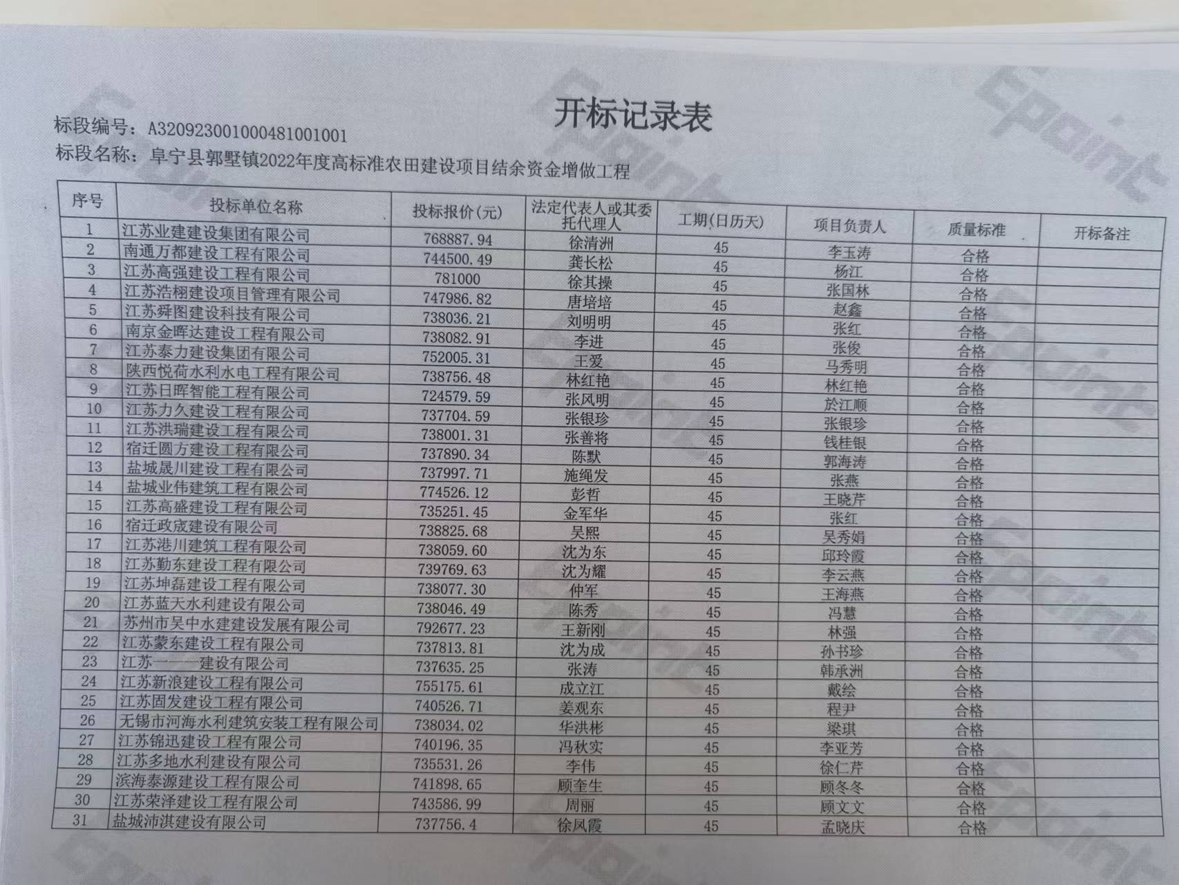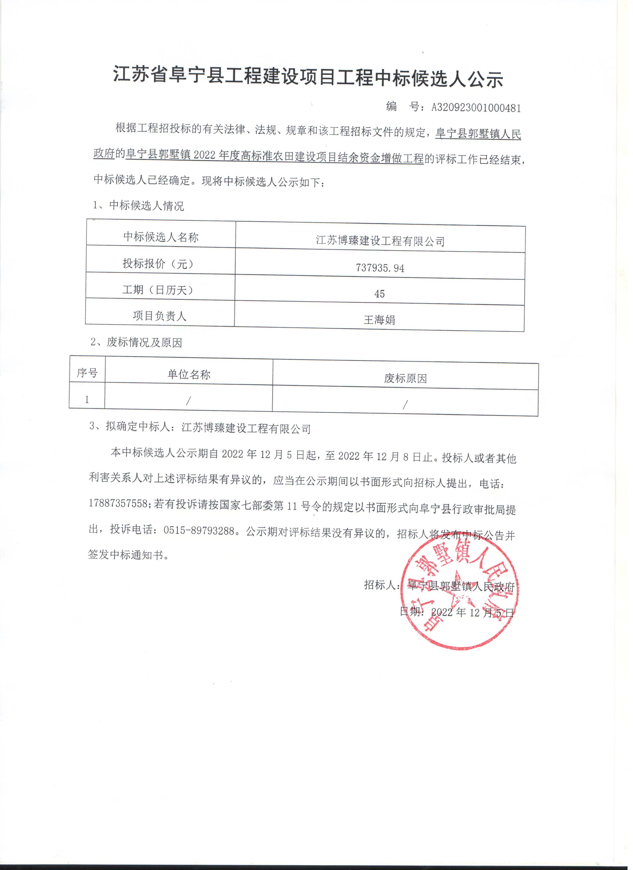 阜宁县郭墅镇2022年度高标准农田建设项目结余资金增做工程中标候选人公示