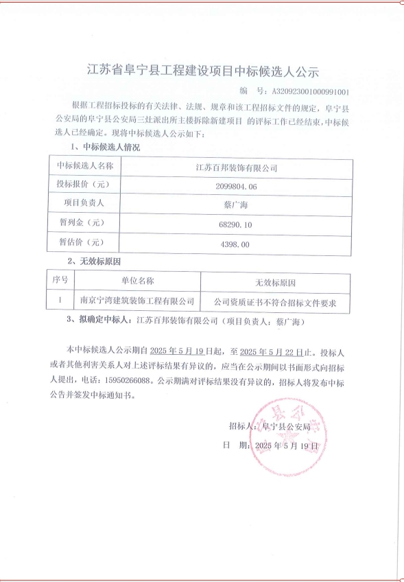 阜宁县公安局三灶派出所主楼拆除新建项目中标候选人公示