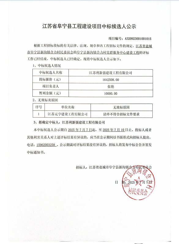 阜宁县新沟镇合力村党群服务中心建设工程中标候选人公示