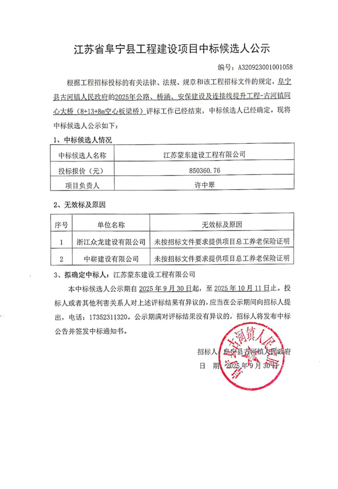 2025年公路、桥涵、安保建设及连接线提升工程-古河镇同心大桥(8+13+8m空心板梁桥)中标候选人公示