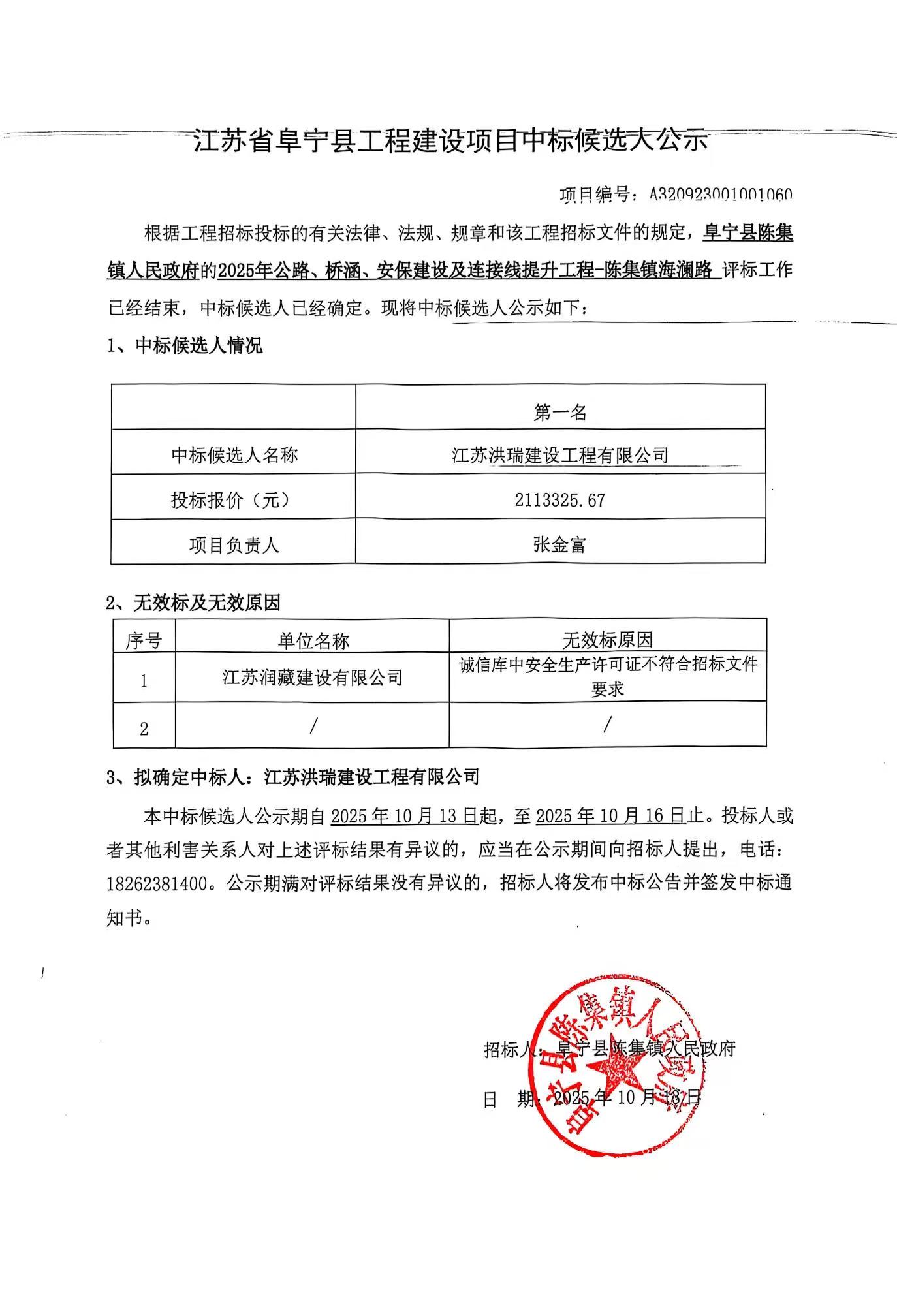 2025年公路、桥涵、安保建设及连接线提升工程-陈集镇海澜路中标候选人公示