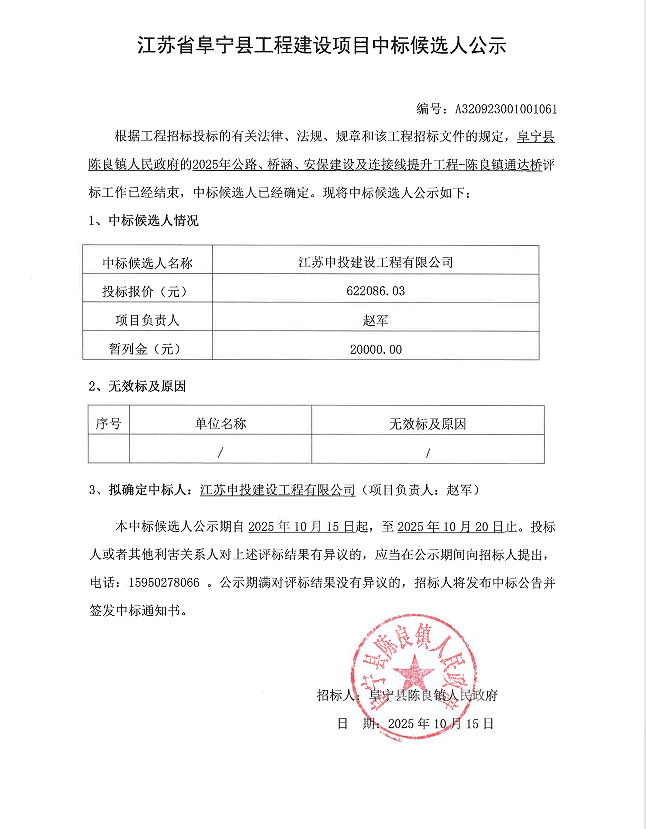 2025年公路、桥涵、安保建设及连接线提升工程-陈良镇通达桥中标候选人公示