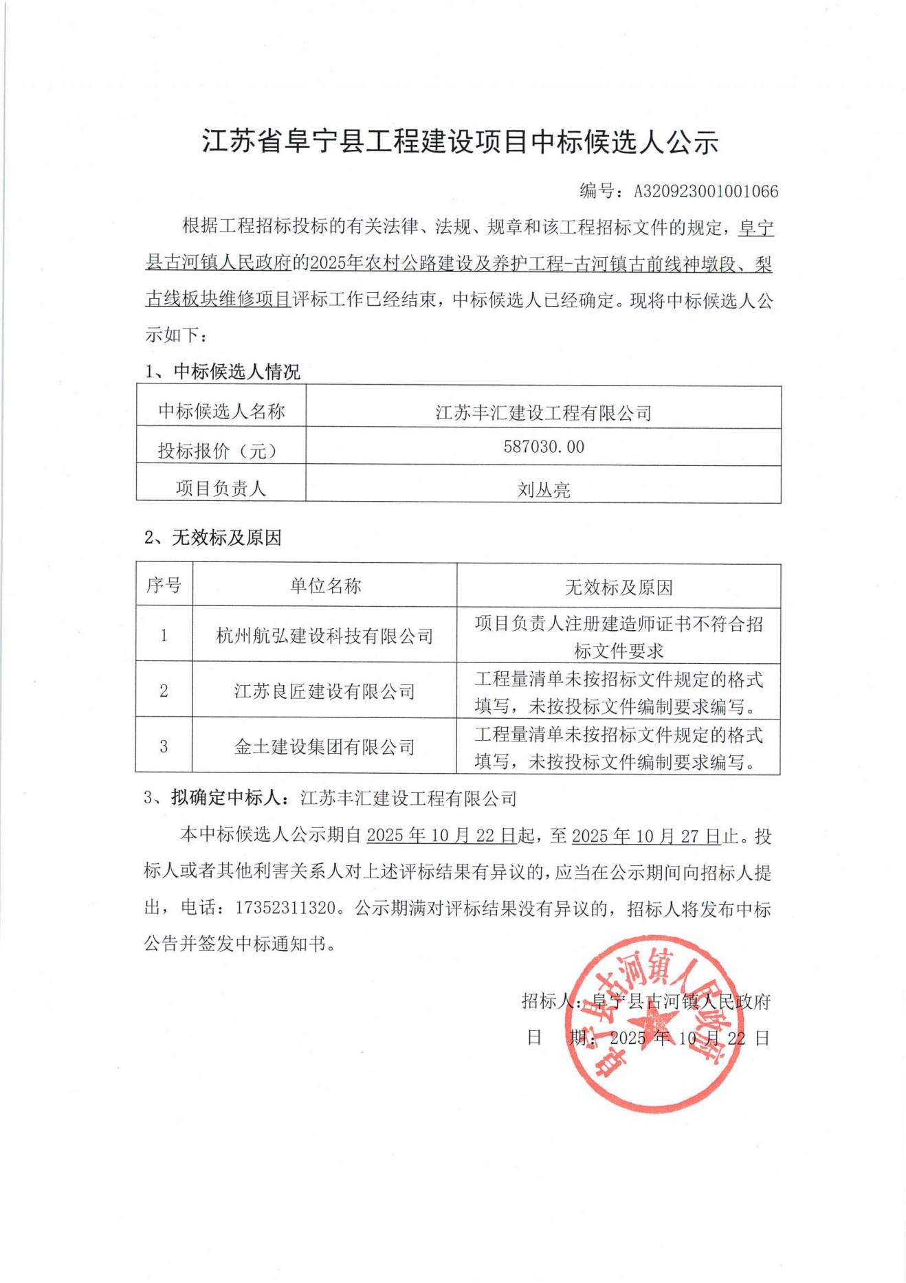 2025年农村公路建设及养护工程-古河镇古前线神墩段、梨古线板块维修项目中标候选人公示