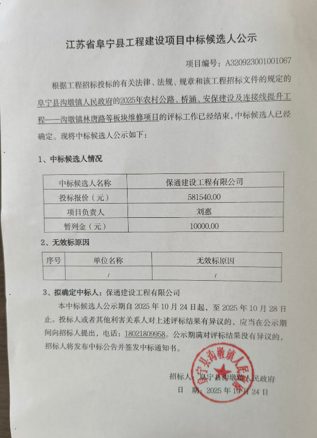 2025年农村公路、桥涵、安保建设及连接线提升工程——沟墩镇林唐路等板块维修项目中标候选人公示