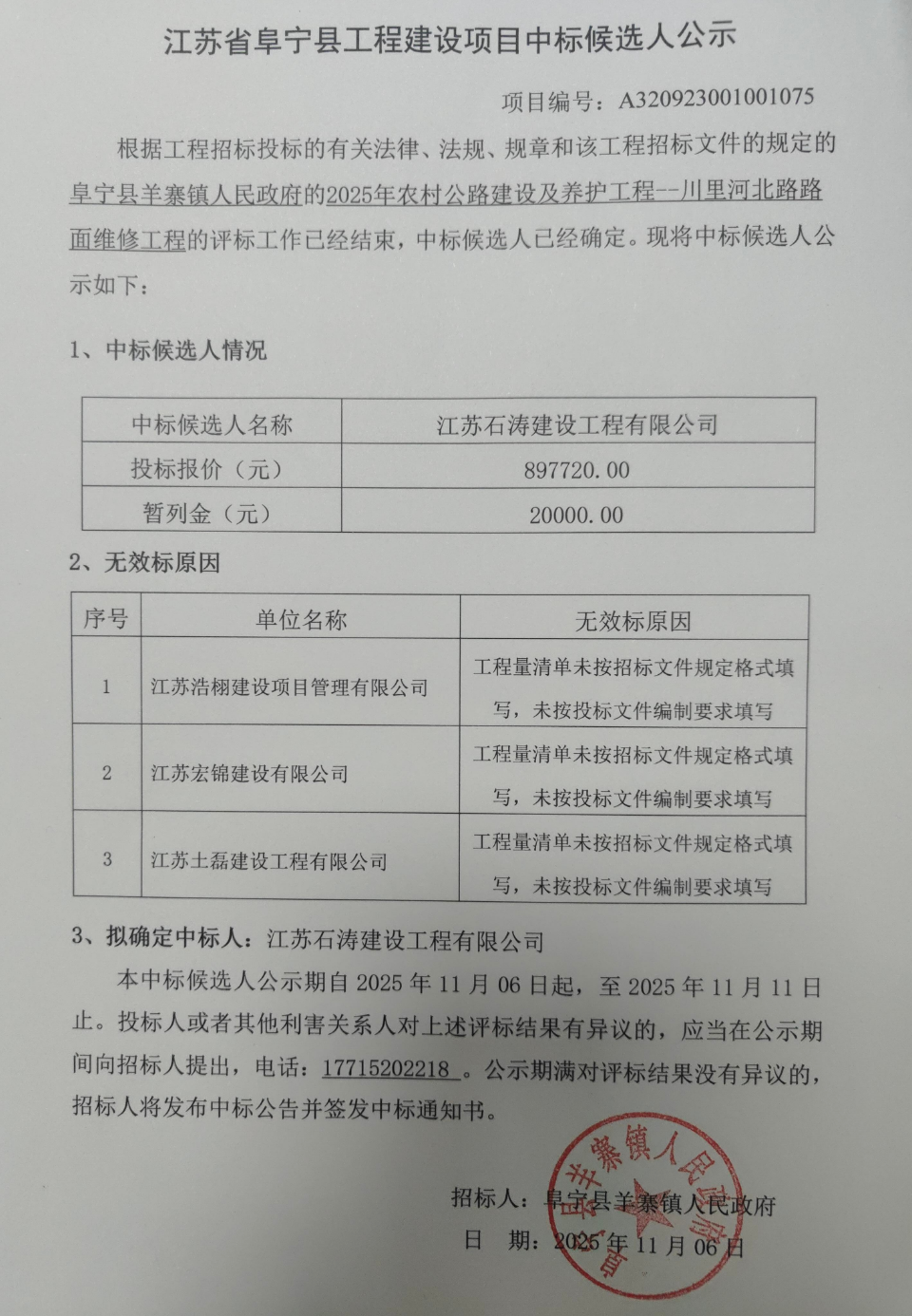 2025年农村公路建设及养护工程--川里河北路路面维修工程中标候选人公示