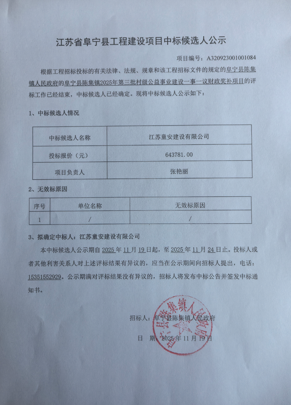 阜宁县陈集镇2025年第三批村级公益事业建设一事一议财政奖补项目中标候选人公示