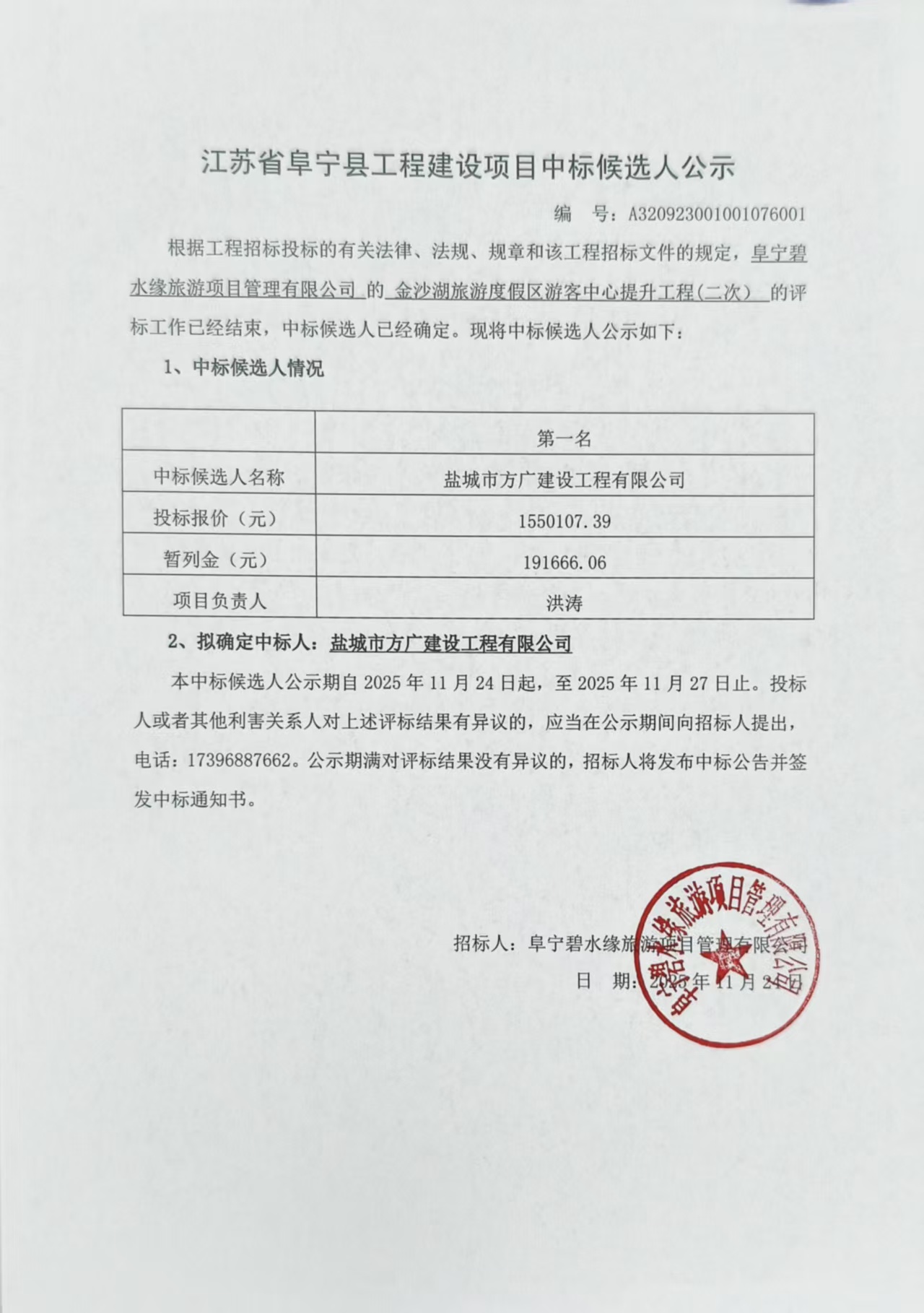 金沙湖旅游度假区游客中心提升工程中标候选人公示