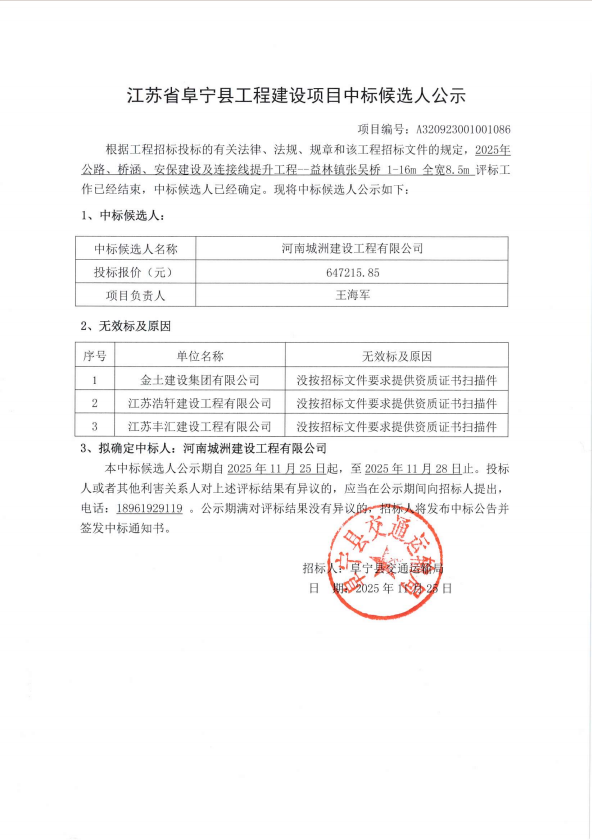 2025年公路、桥涵、安保建设及连接线提升工程--益林镇张吴桥 1-16m 全宽8.5m中标候选人公示