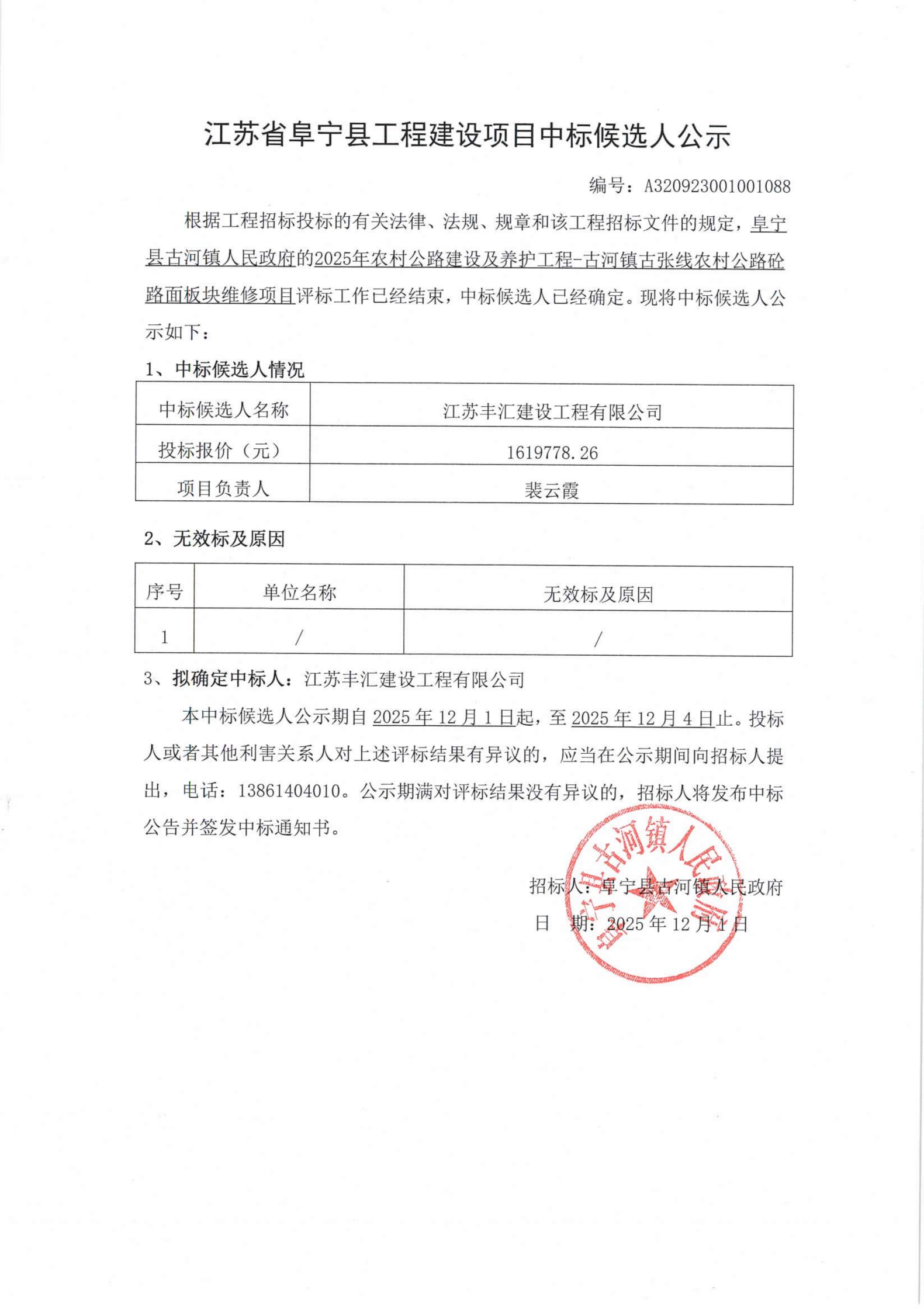 2025年农村公路建设及养护工程-古河镇古张线农村公路砼路面板块维修项目中标候选人公示