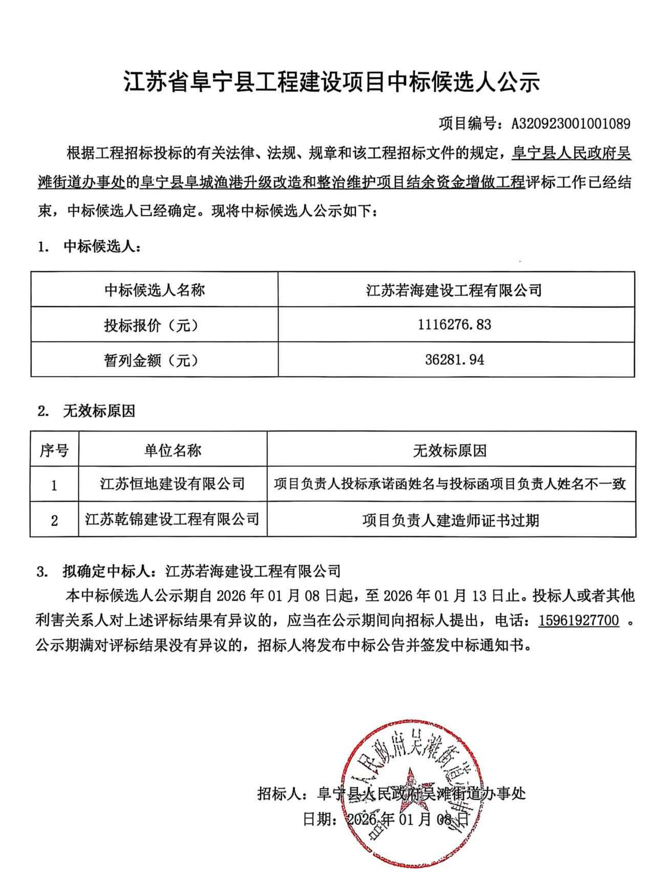 阜宁县阜城渔港升级改造和整治维护项目结余资金增做工程中标候选人公示