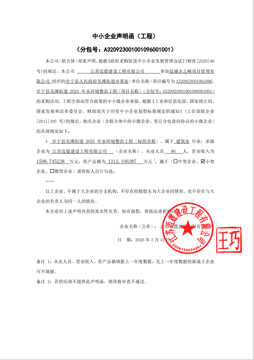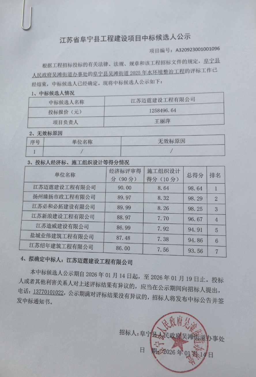 阜宁县吴滩街道2025年水环境整治工程中标候选人公示