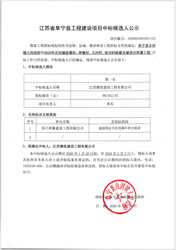 2025年古河镇前墩村、神墩村、大冲村、张刘村新建仓储项目附属工程中标候选人公示