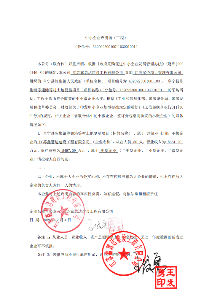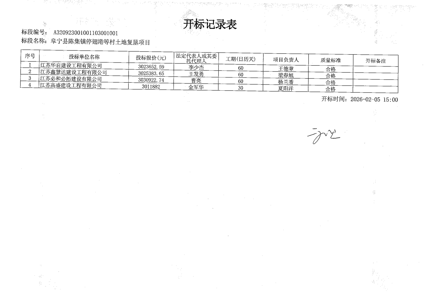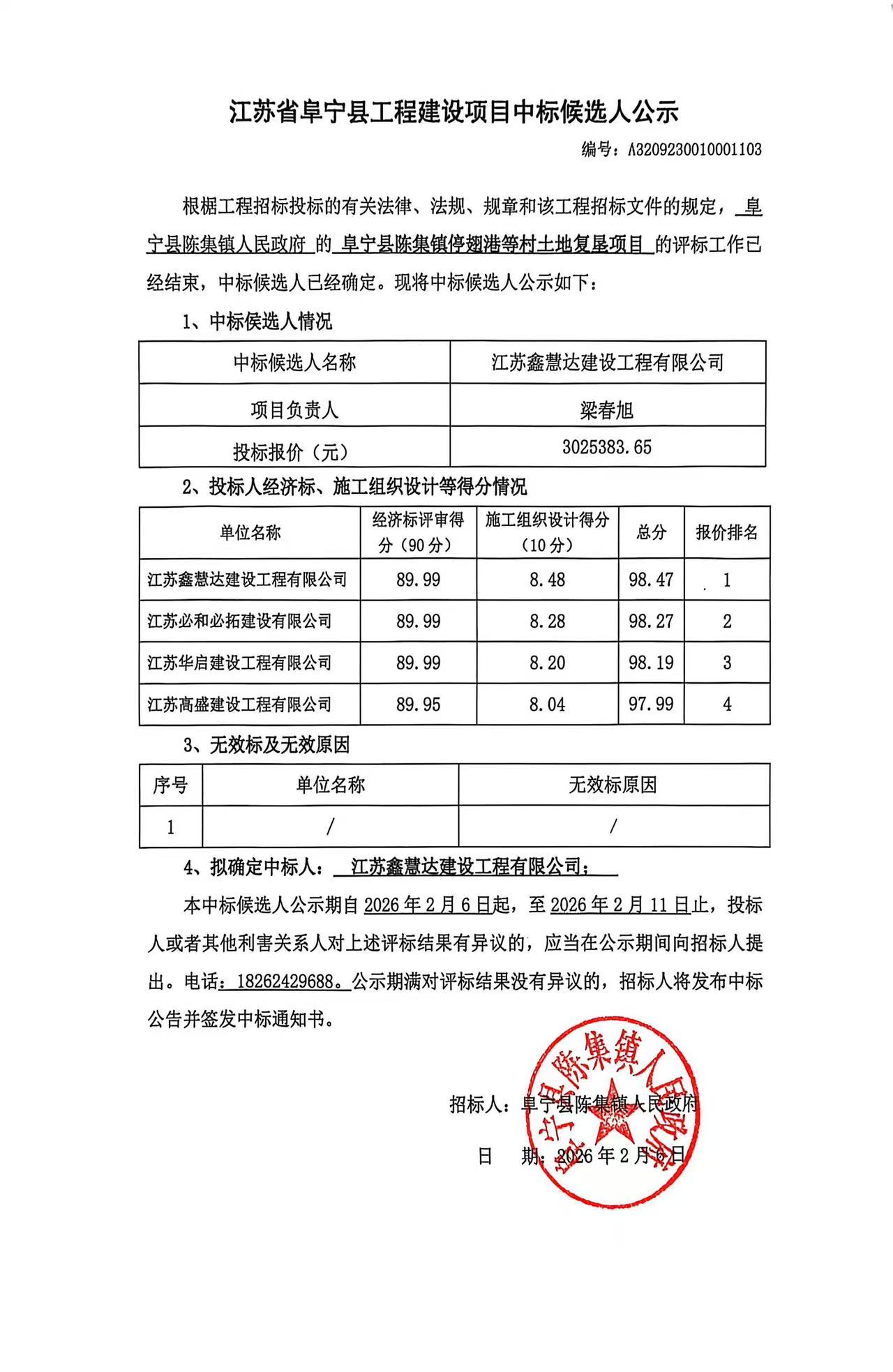 阜宁县陈集镇停翅港等村土地复垦项目中标候选人公示