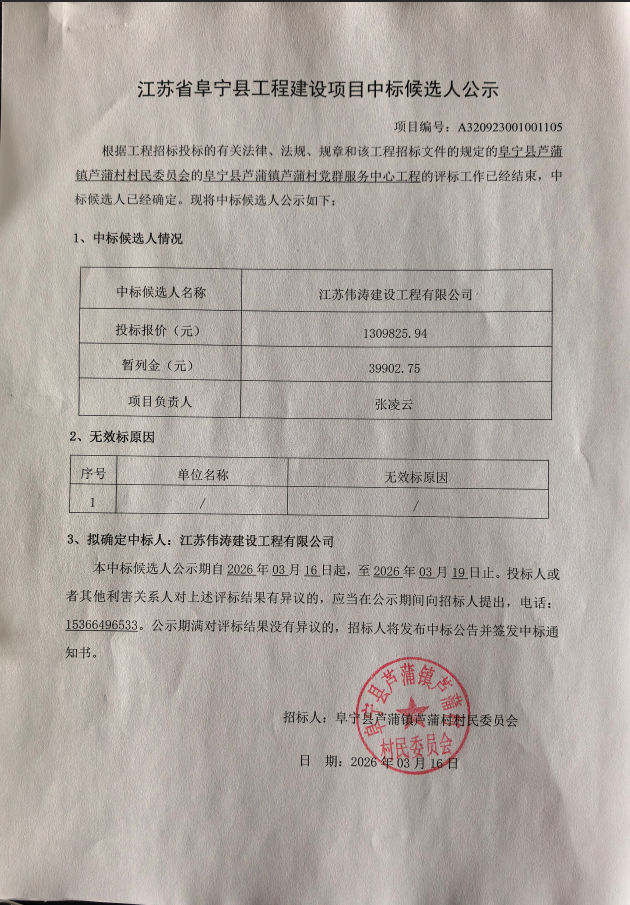 阜宁县芦蒲镇芦蒲村党群服务中心工程中标候选人公示