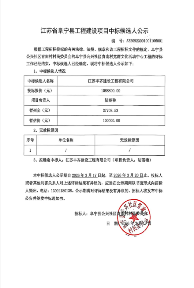阜宁县公兴社区青南村党群文化活动中心工程中标候选人公示