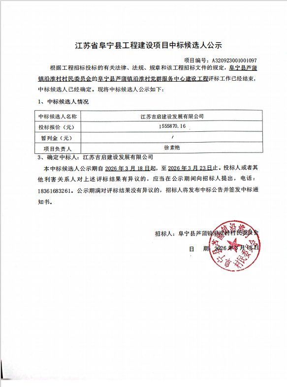 阜宁县芦蒲镇沿淮村党群服务中心建设工程中标候选人公示