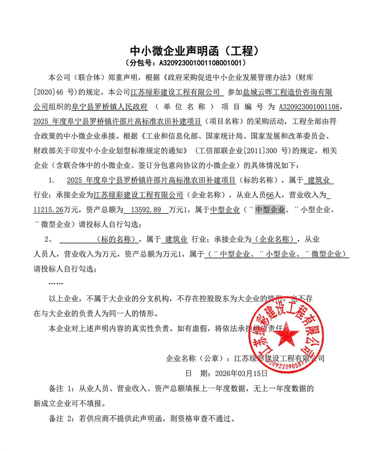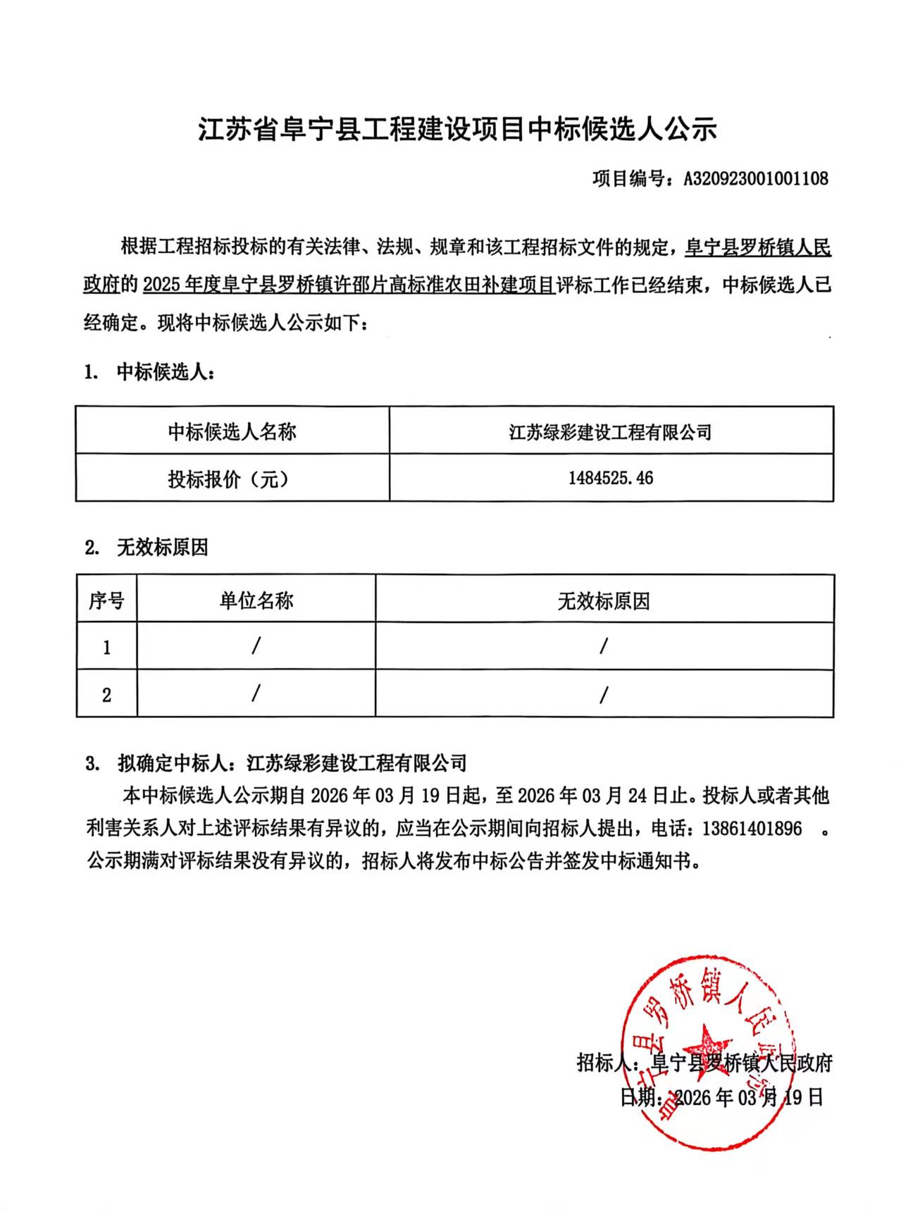 2025年度阜宁县罗桥镇许邵片高标准农田补建项目中标候选人公示