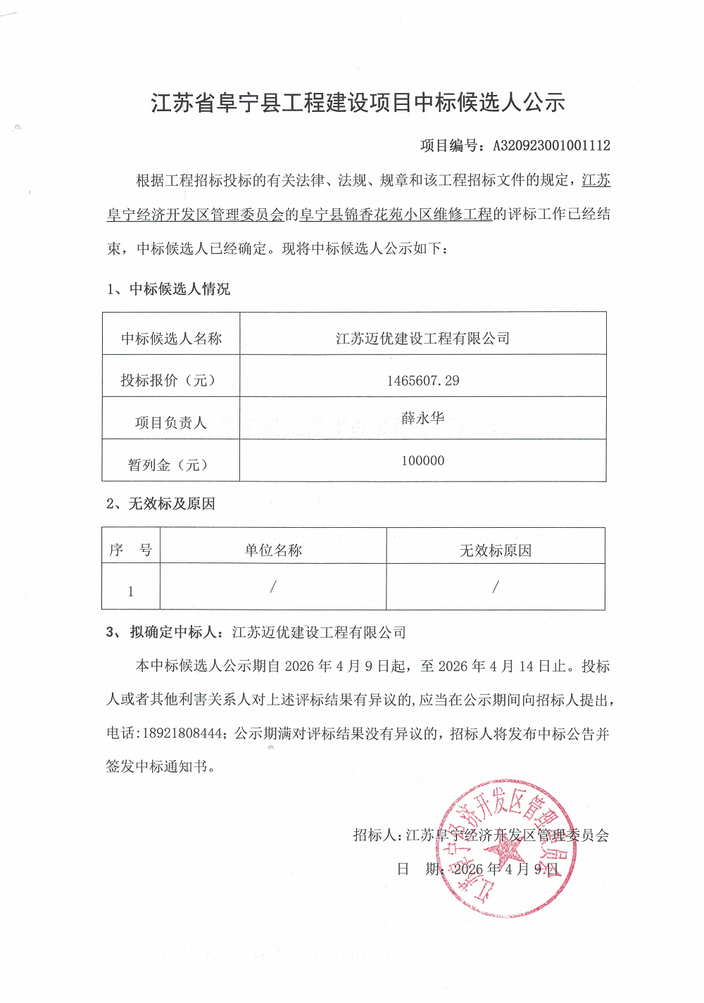 阜宁县锦香花苑小区维修工程中标候选人公示