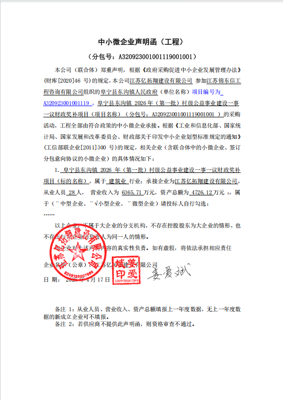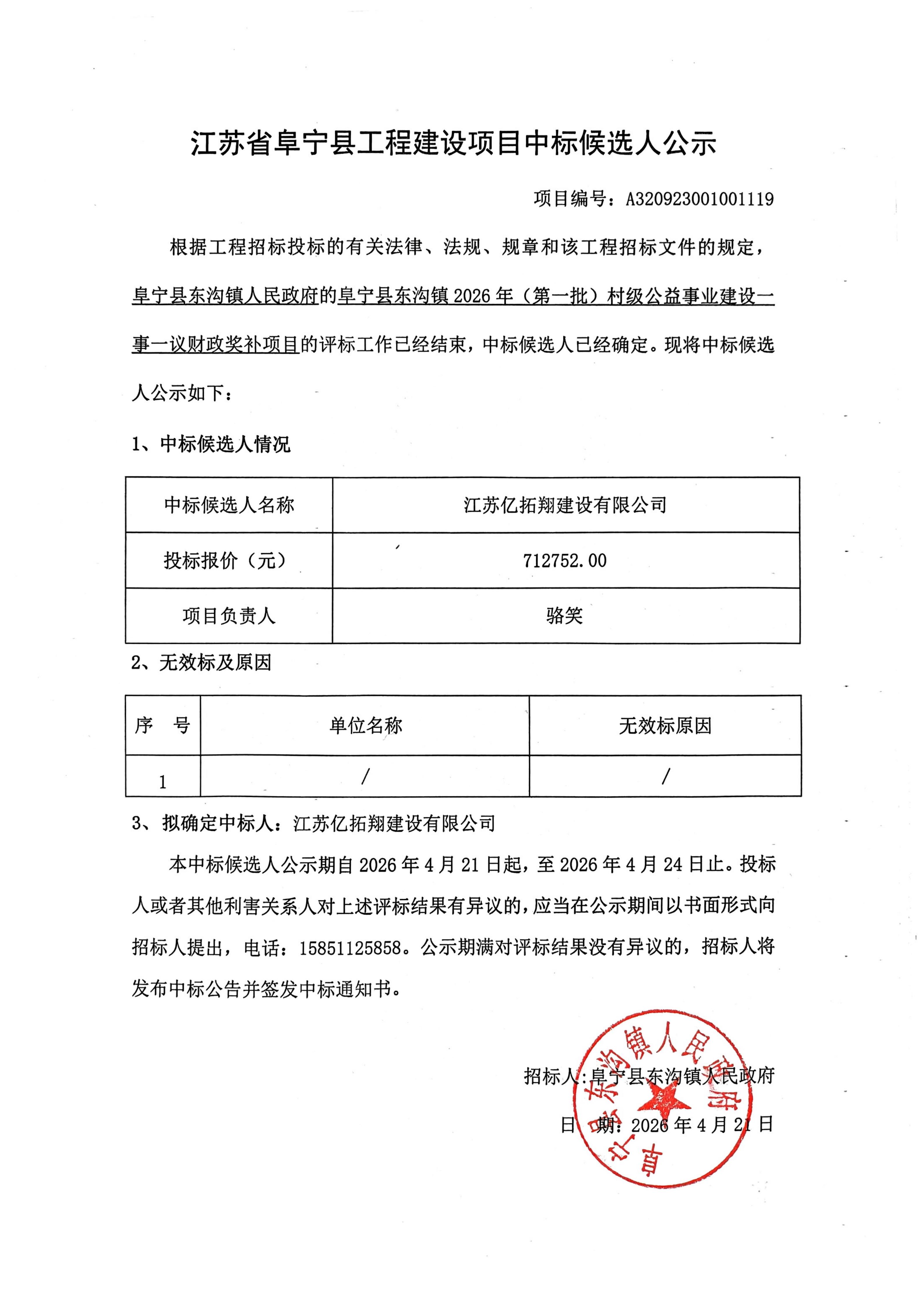 阜宁县东沟镇2026年(第一批)村级公益事业建设一事一议财政奖补项目中标候选人公示