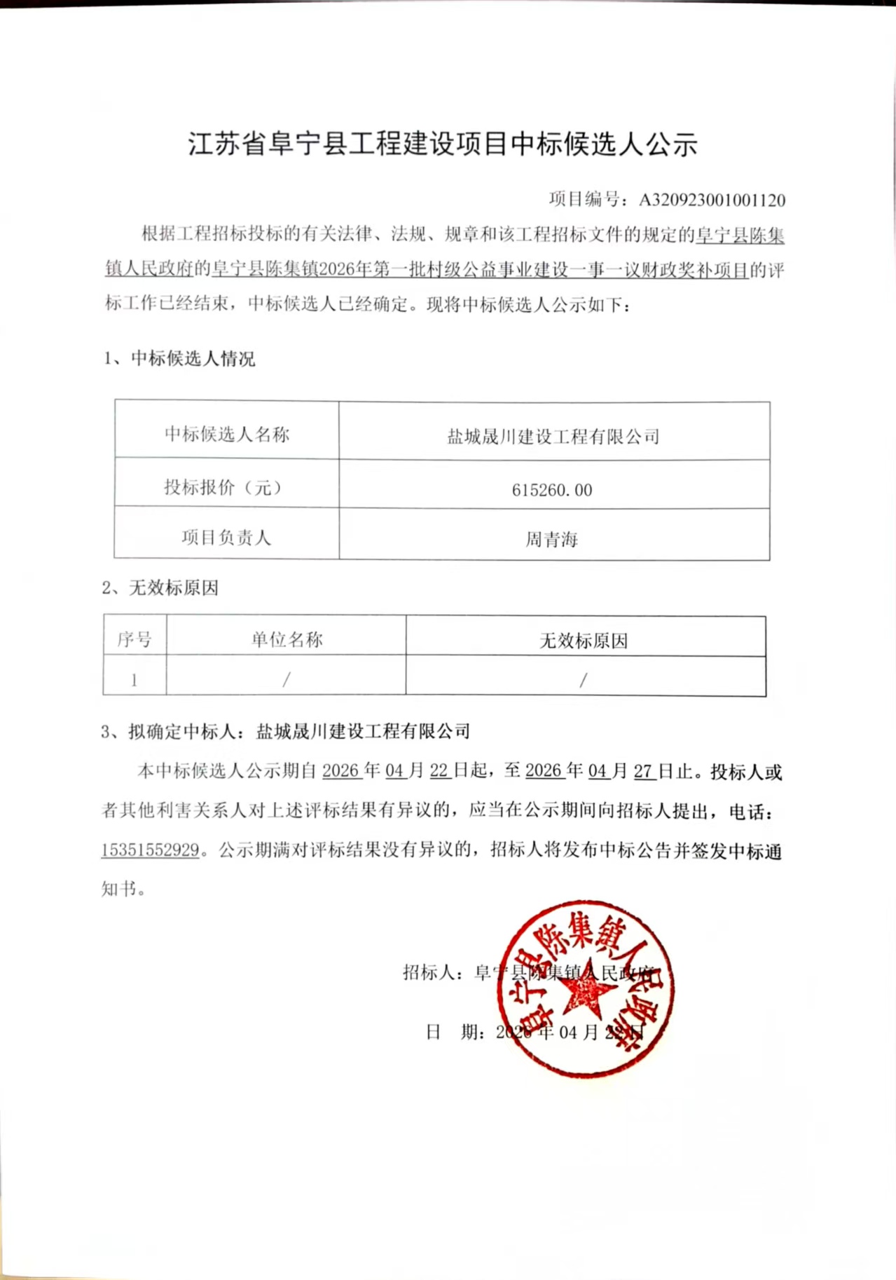 阜宁县陈集镇2026年第一批村级公益事业建设一事一议财政奖补项目中标候选人公示