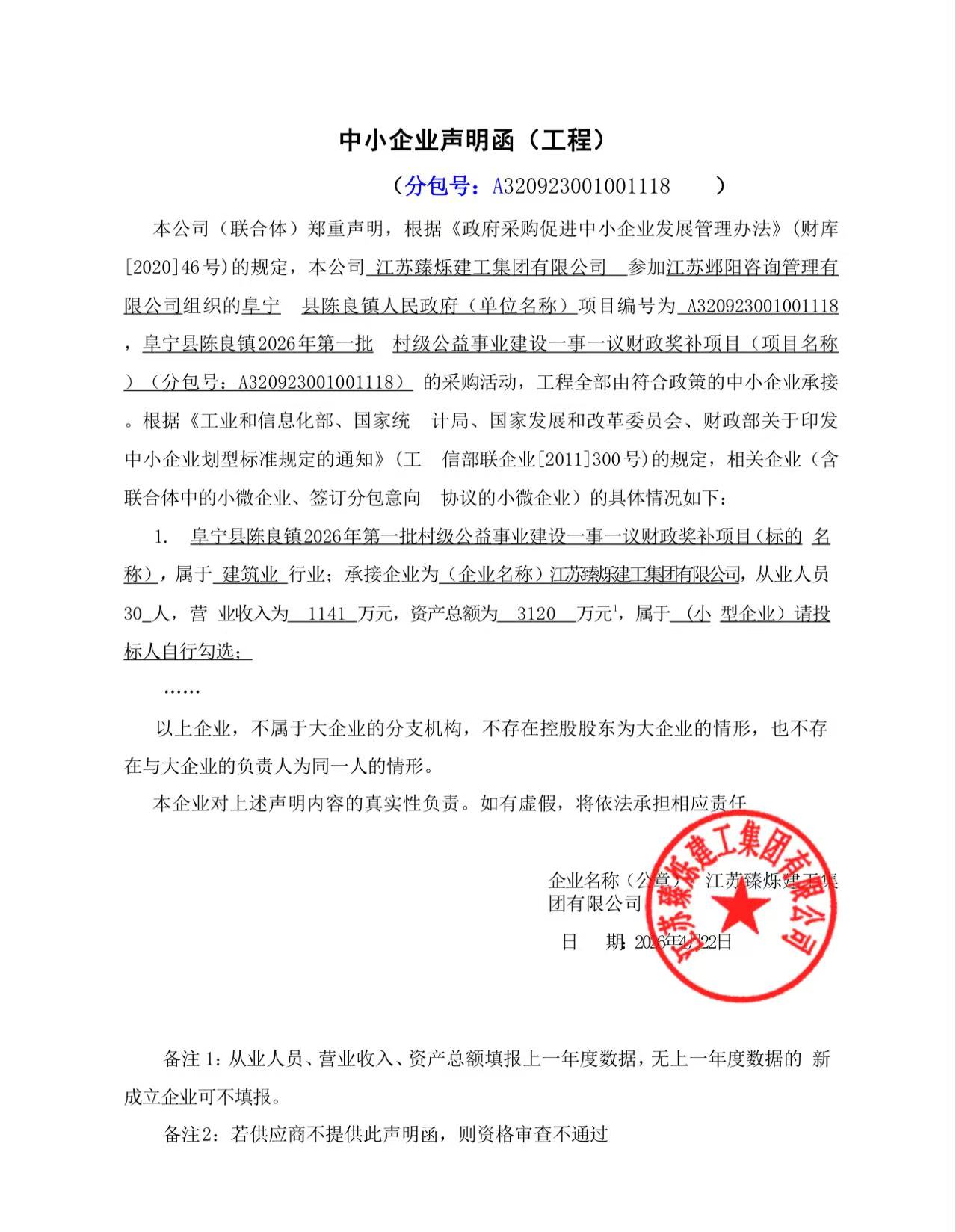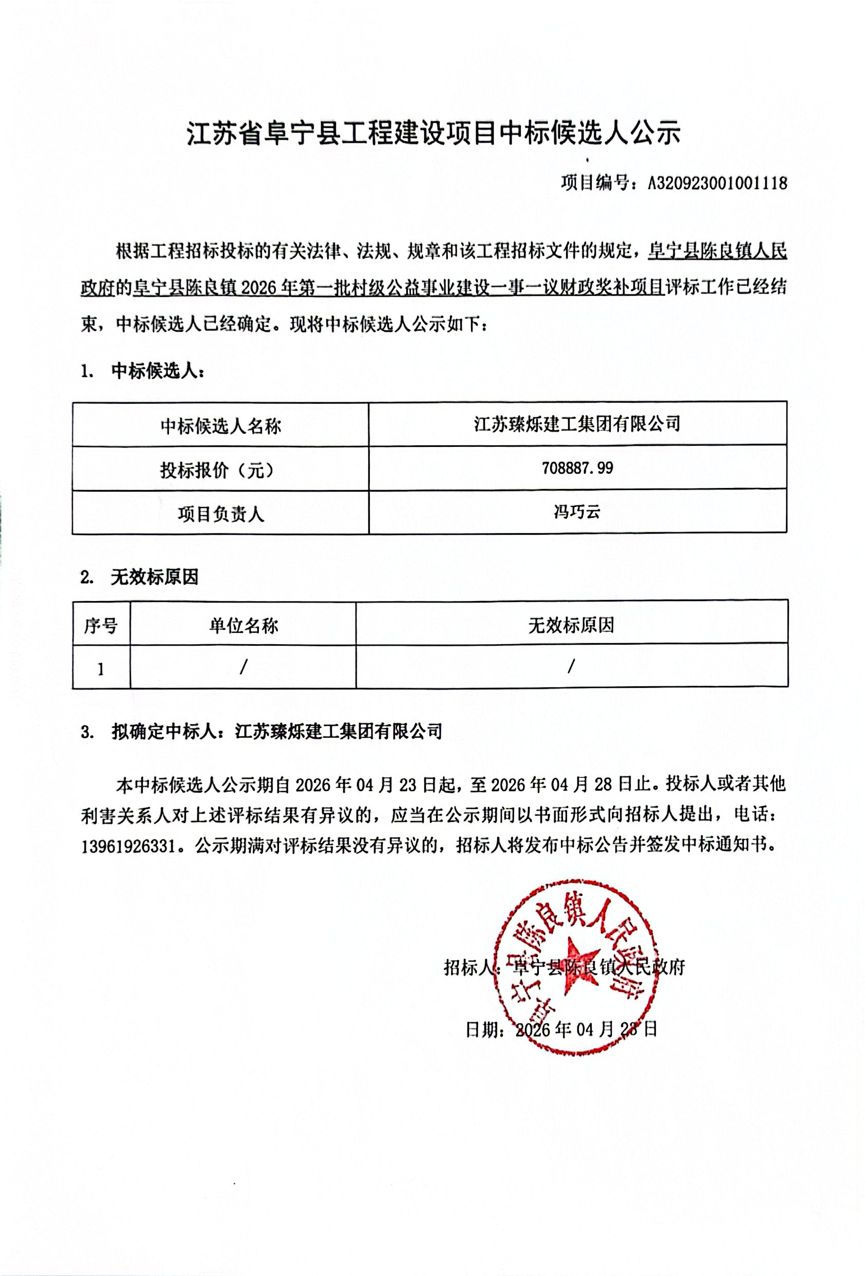 阜宁县陈良镇2026年第一批村级公益事业建设一事一议财政奖补项目中标候选人公示