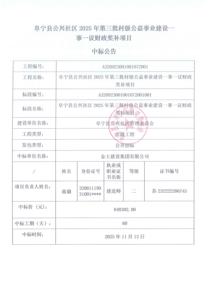 阜宁县公兴社区2025年第三批村级公益事业建设一事一议财政奖补项目