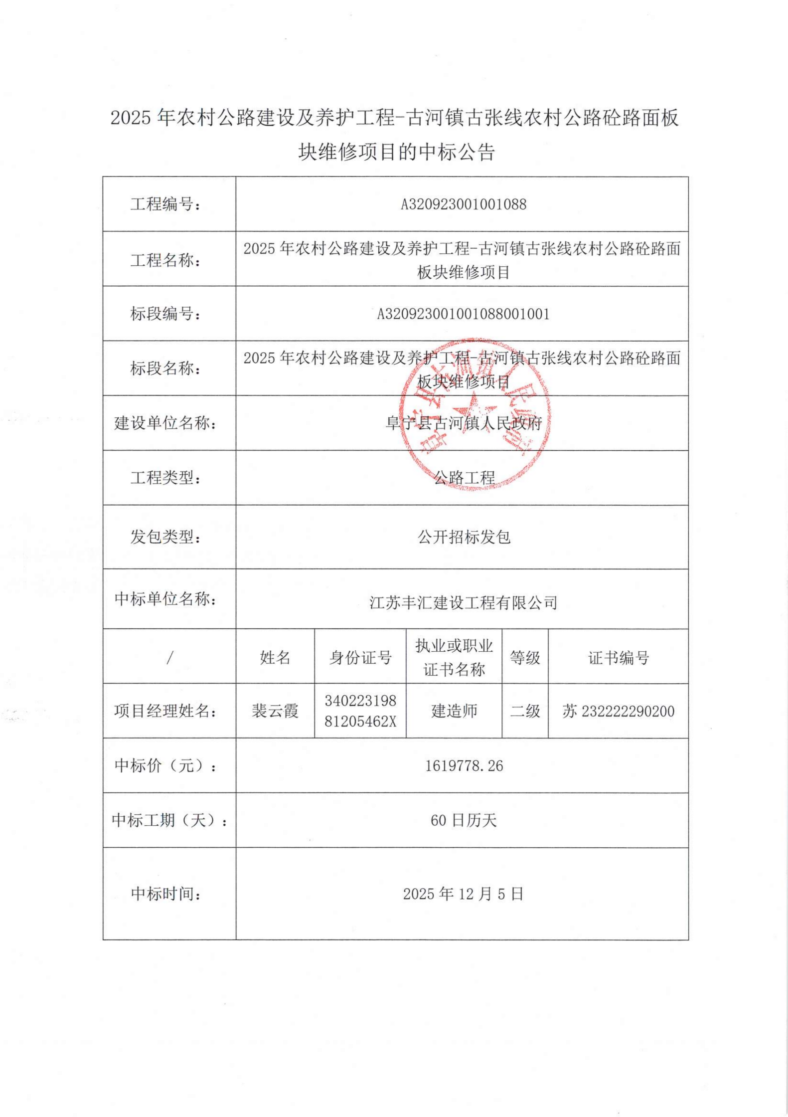 2025年农村公路建设及养护工程-古河镇古张线农村公路砼路面板块维修项目