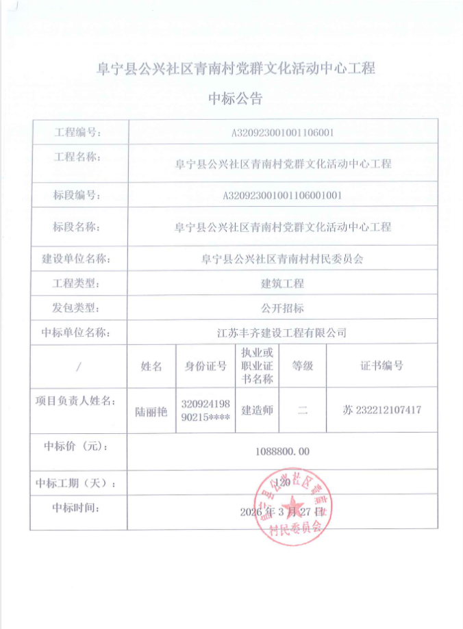 阜宁县公兴社区青南村党群文化活动中心工程