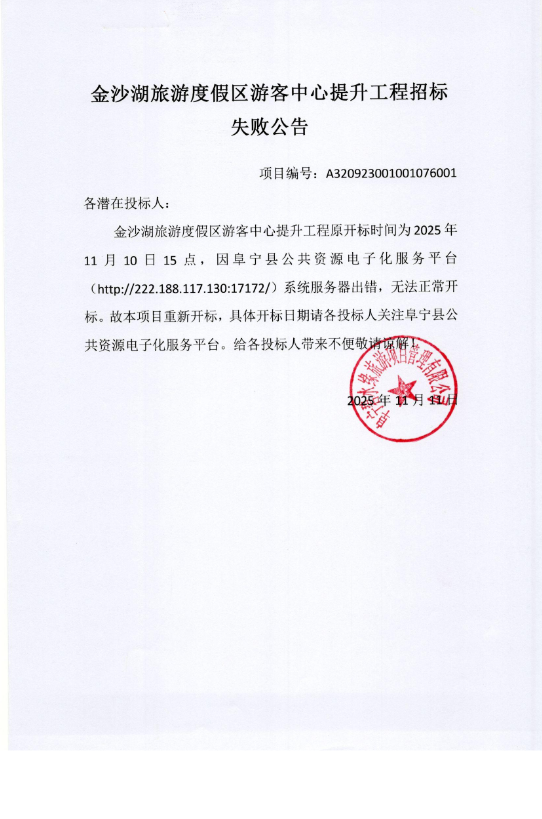 金沙湖旅游度假区游客中心提升工程招标失败公告