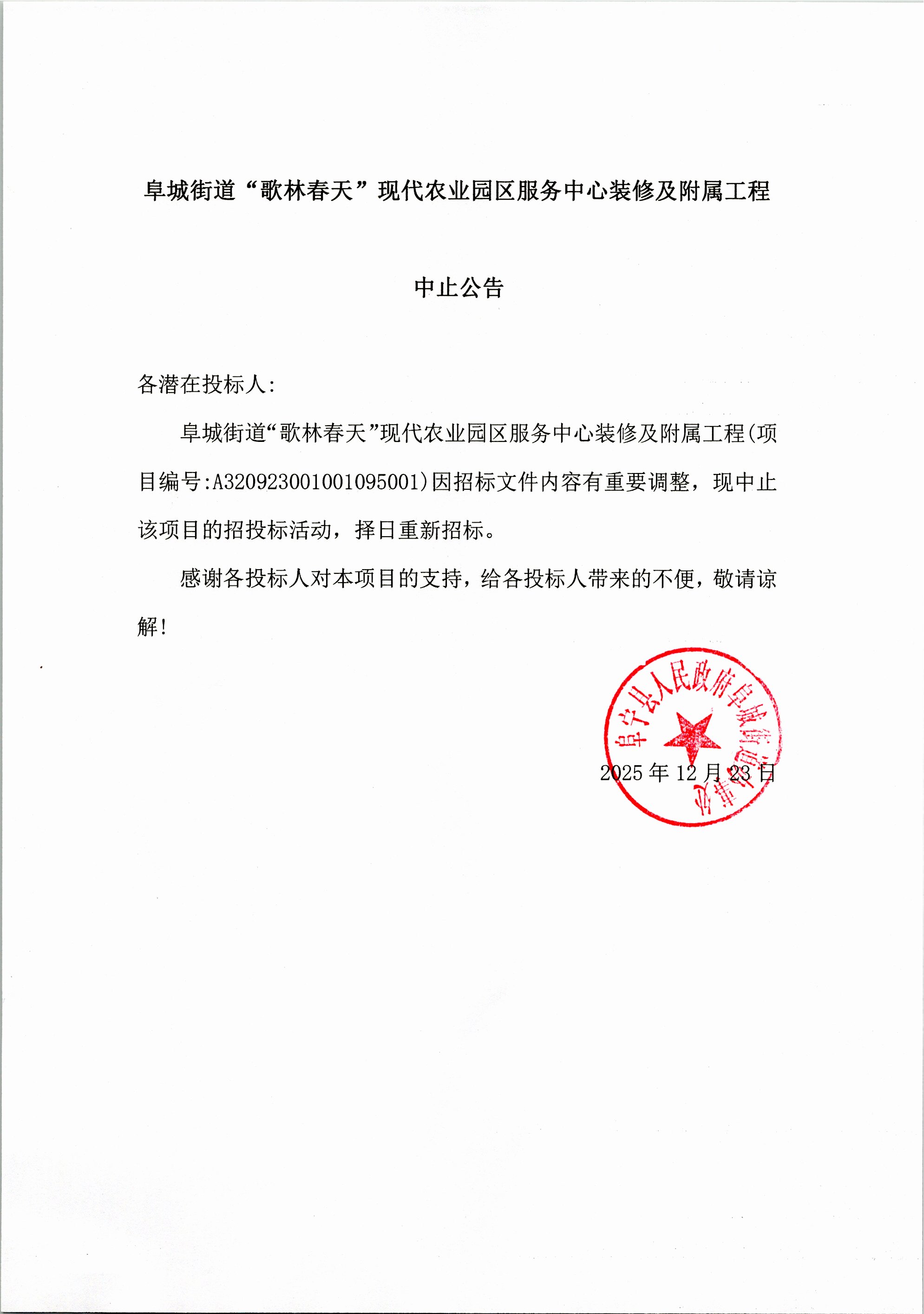 阜城街道“歌林春天”现代农业园区服务中心装修及附属工程中止公告
