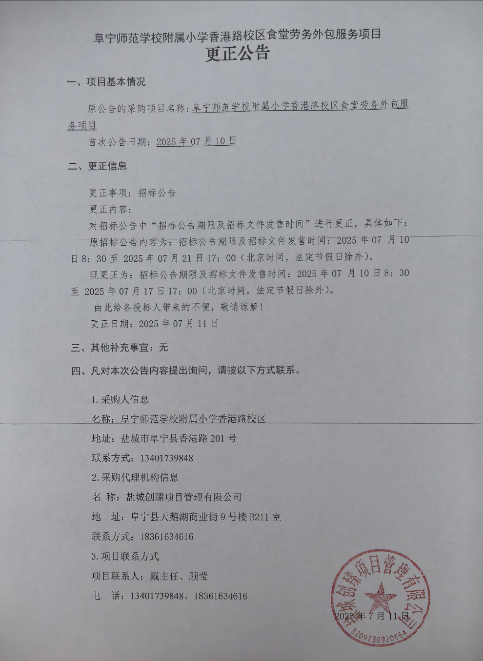阜宁师范学校附属小学香港路校区食堂劳务外包服务项目